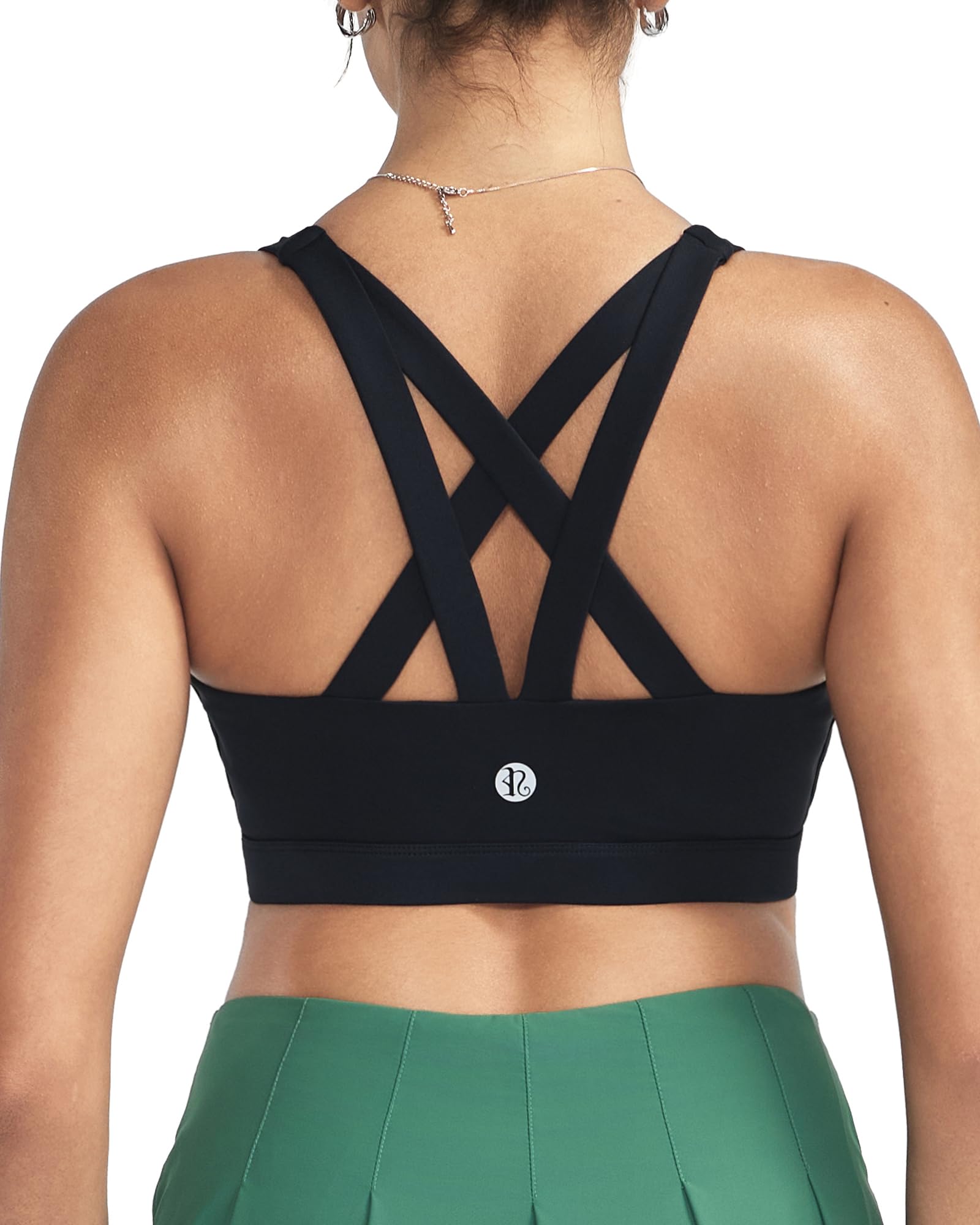 WHY WE MADE THIS:Need a sports bra that does it all? Look no further! This sweat-wicking cross-strap bra gives you the coverage and support you need for yoga, run, and the gymβwithout restricting your movement or breath. fabric has added lycra that allows the bra to stretch with you and retain its shape over time. Slip in optional, removable cups for full coverageβif you want it. This bra is intended to provide medium support for great shape retention, long-lasting comfort.