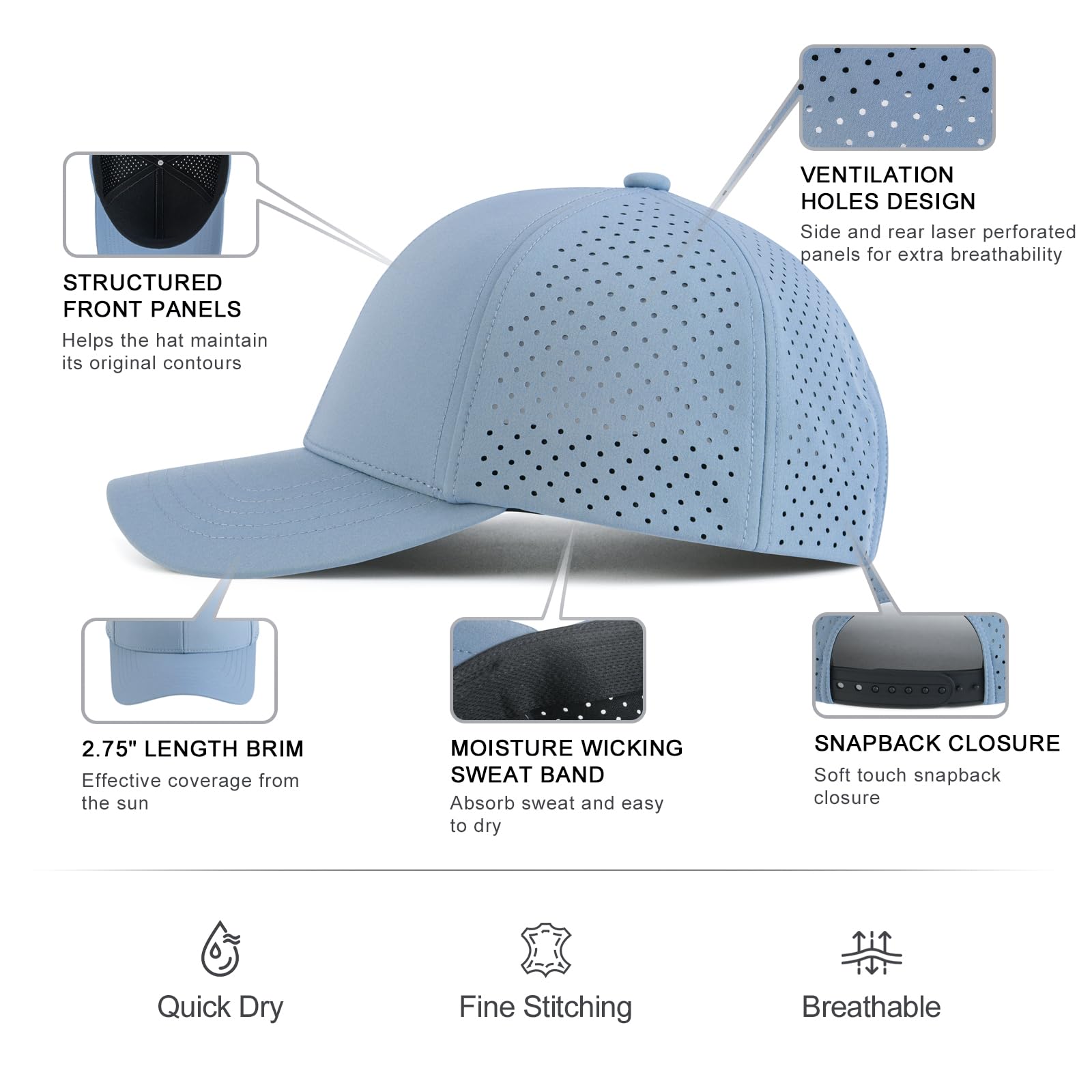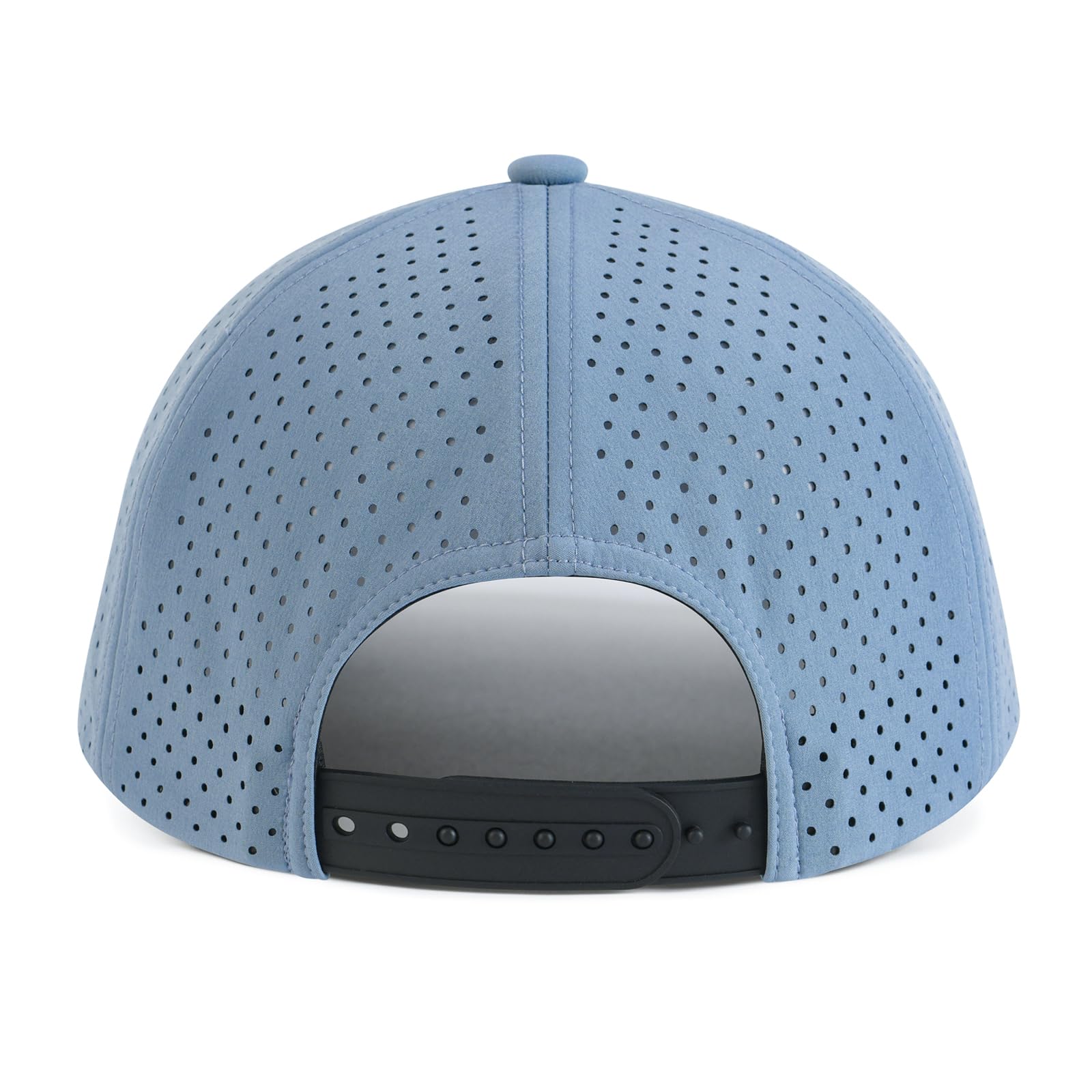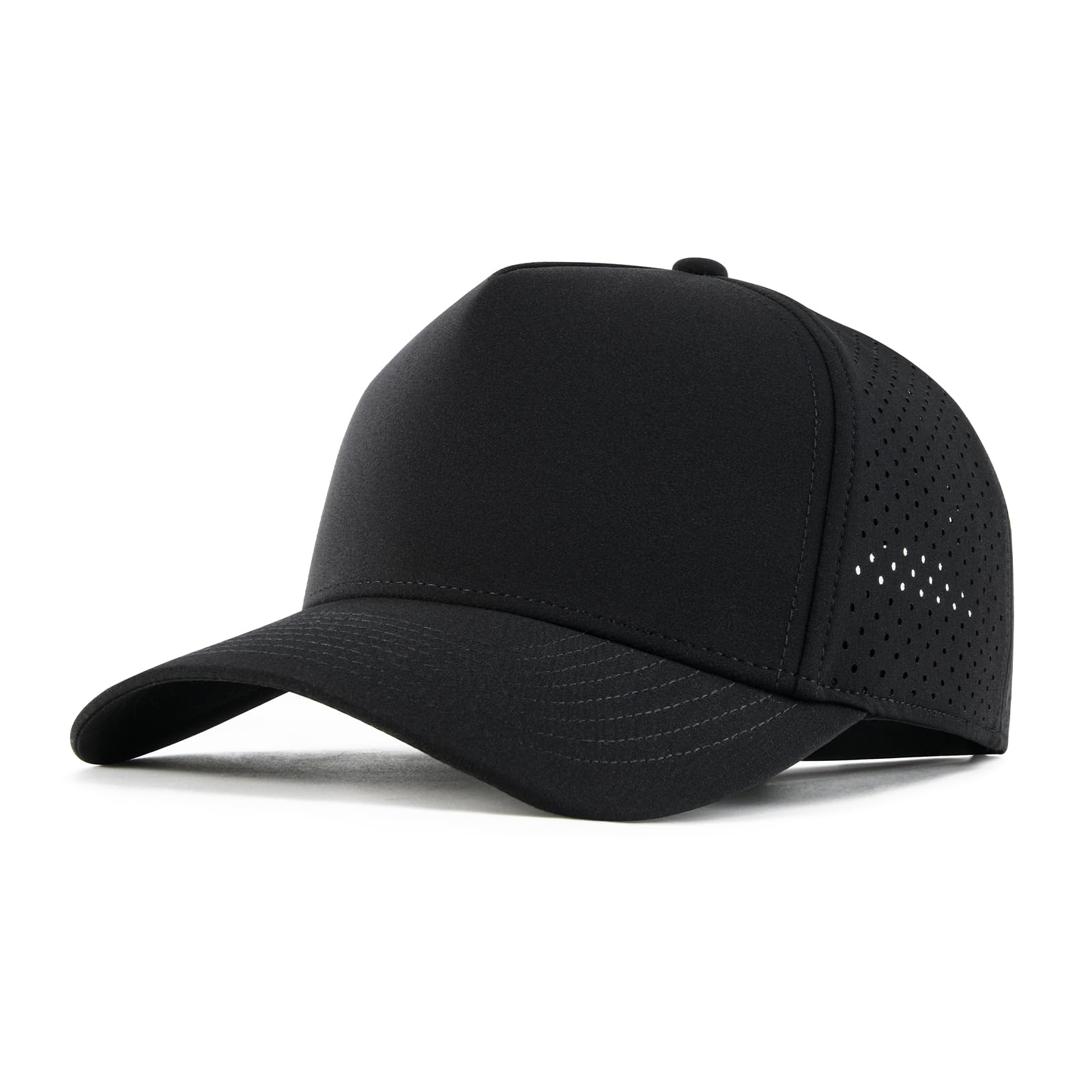 Design: structured front panels, 6-panel cap, curved brim, laser-perforated side & rear panels for breathability, and soft touch snapback closure