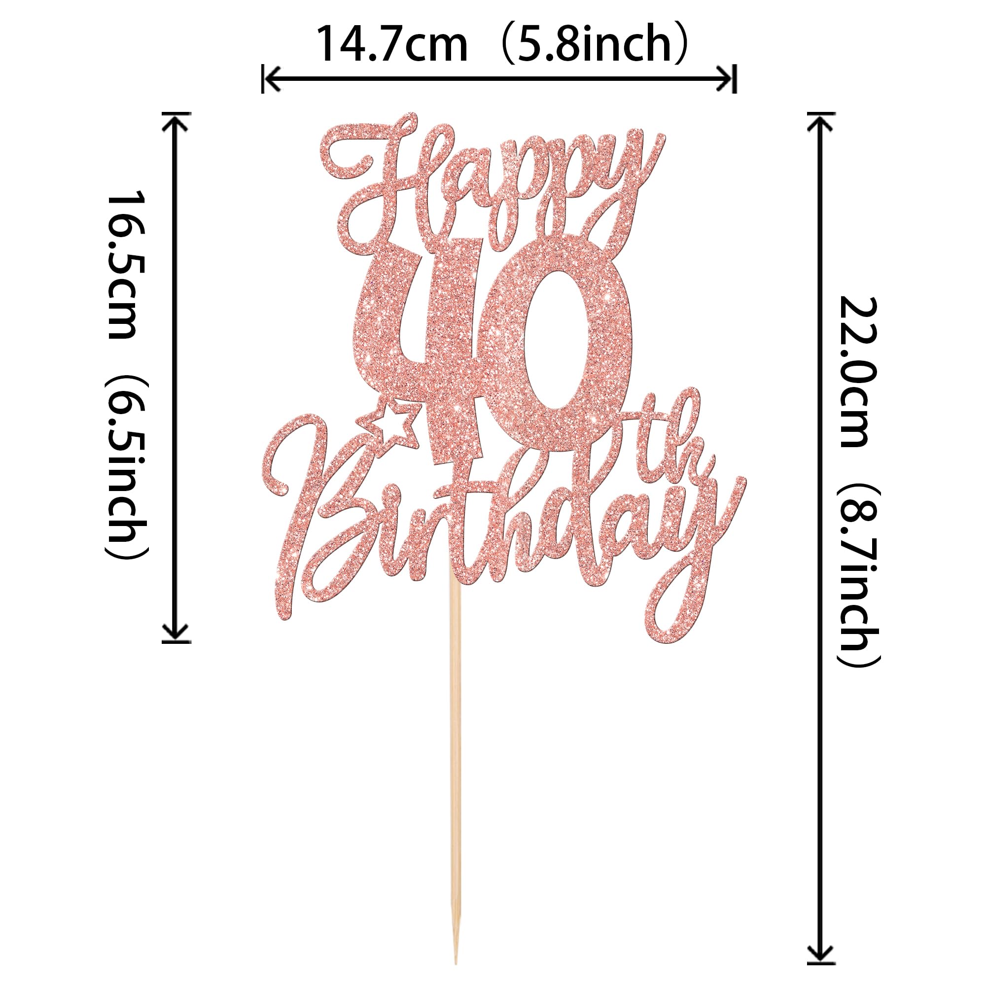 Happy 40th Birthday Cake Topper for Happy 40th Birthday Anniversary Theme Party Cake Decorations Supplies Perfect for happy 40th birthday theme party, cheers to 40 years party,40th anniversary theme party cake decorations supplies. Pack of 1 pcs. The size is W 5.8 inch * H 8.7 inch / W 14.7 cm * H 22 cm ( with stick ) Made of high quality paper card stock and food grade sticks,thick and sturdy. This cake topper is one side glitter, another side is white, and this is intended for decoration only, please do not put them in oven or microwave. If the item you received has any defects, please contact us for refund.we will deal with it within 24 hours.