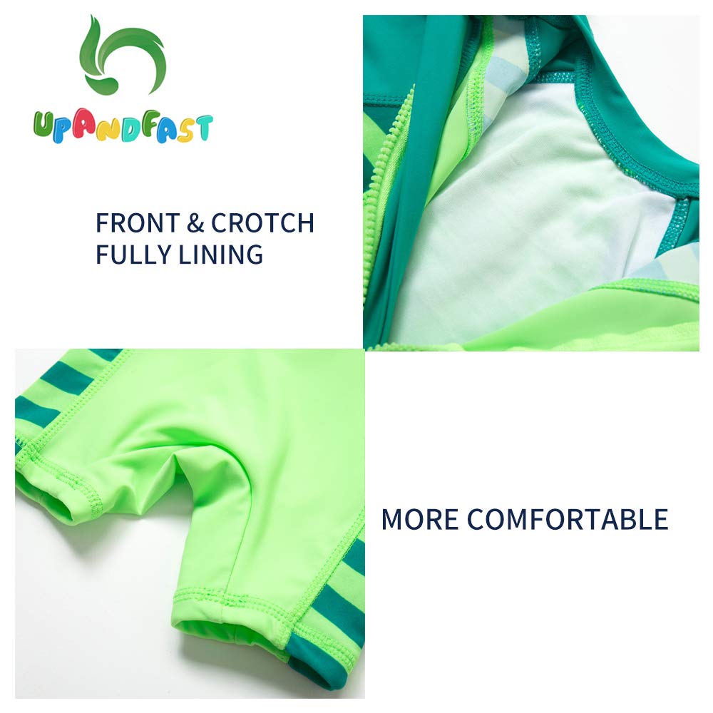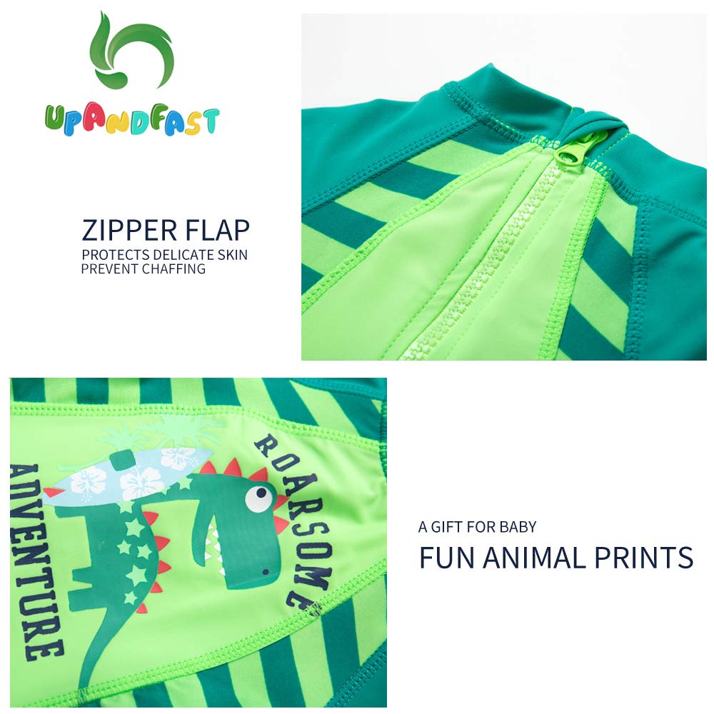 HUMANIZATION DESIGN: This one-piece baby bathing suit has a front / back zip for convenient putting on and taking off. Zipper flap and garage protect your baby's delicate skin