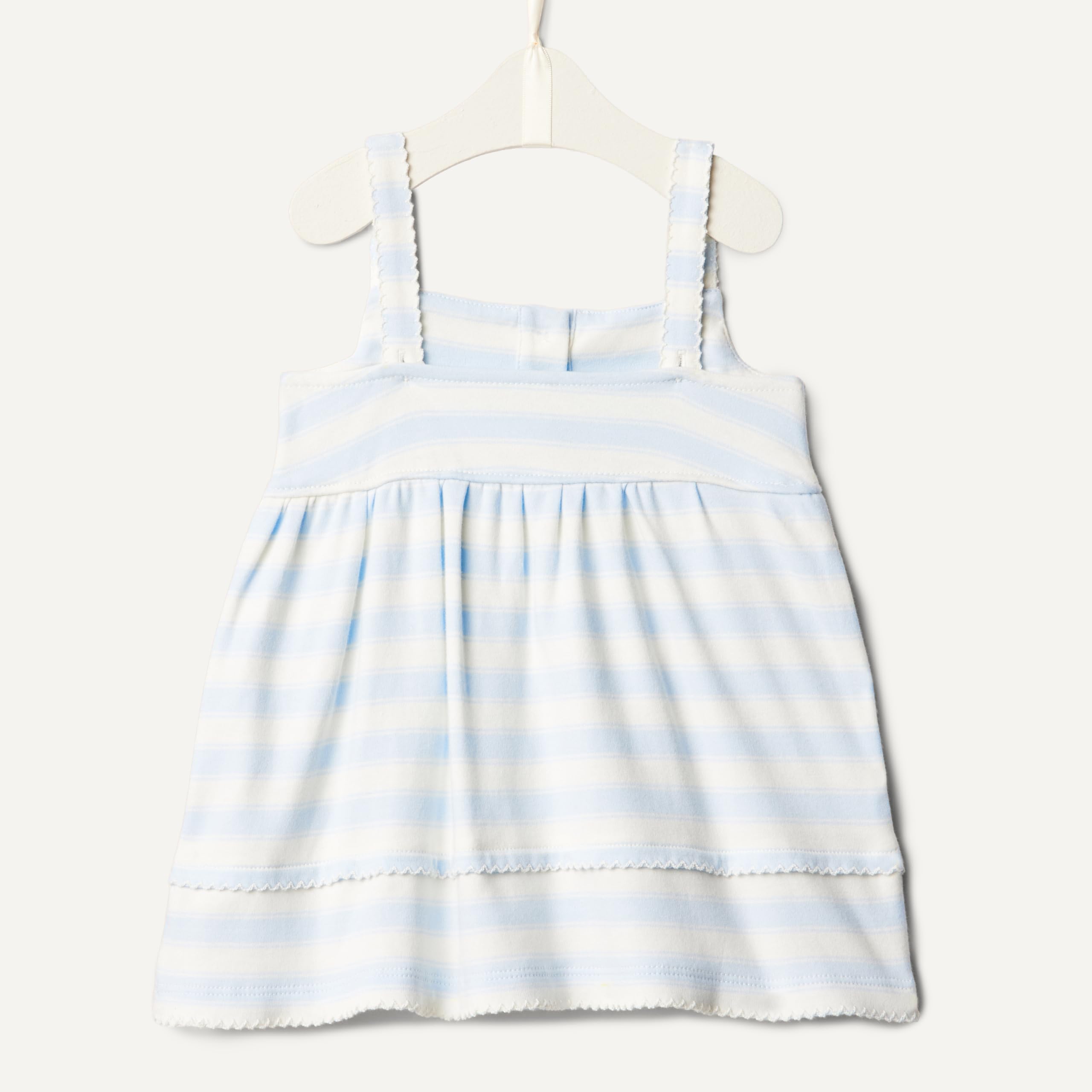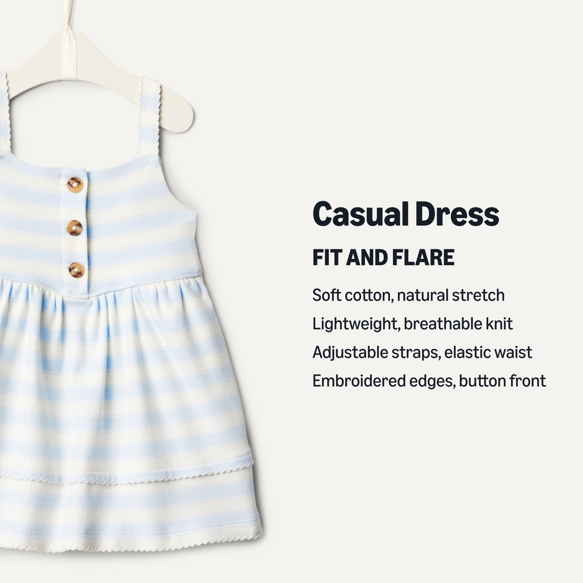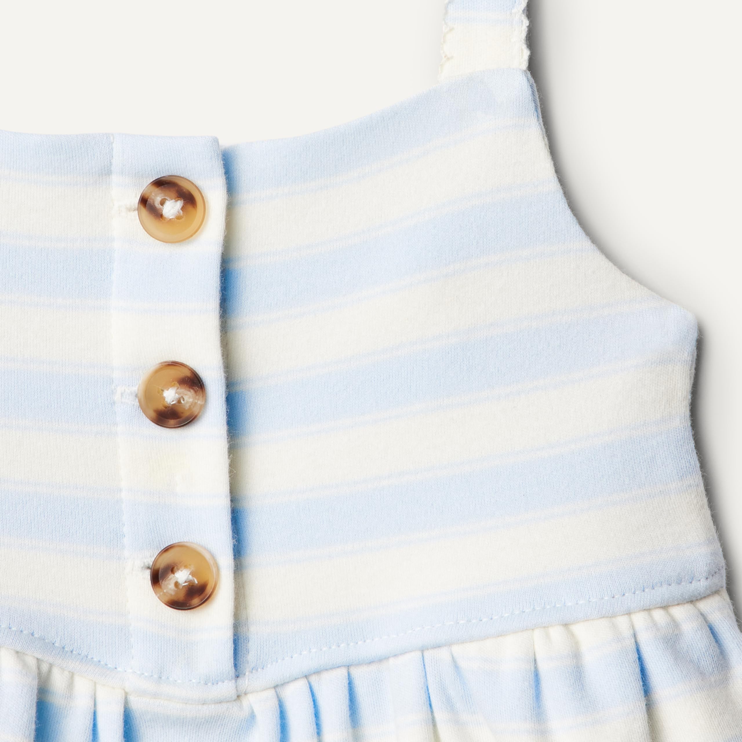 DETAILS: Button front placket, wide straps with interior buttons for adjustability, embroidered edge detailing on the straps and hem, and an elastic waist for added comfort