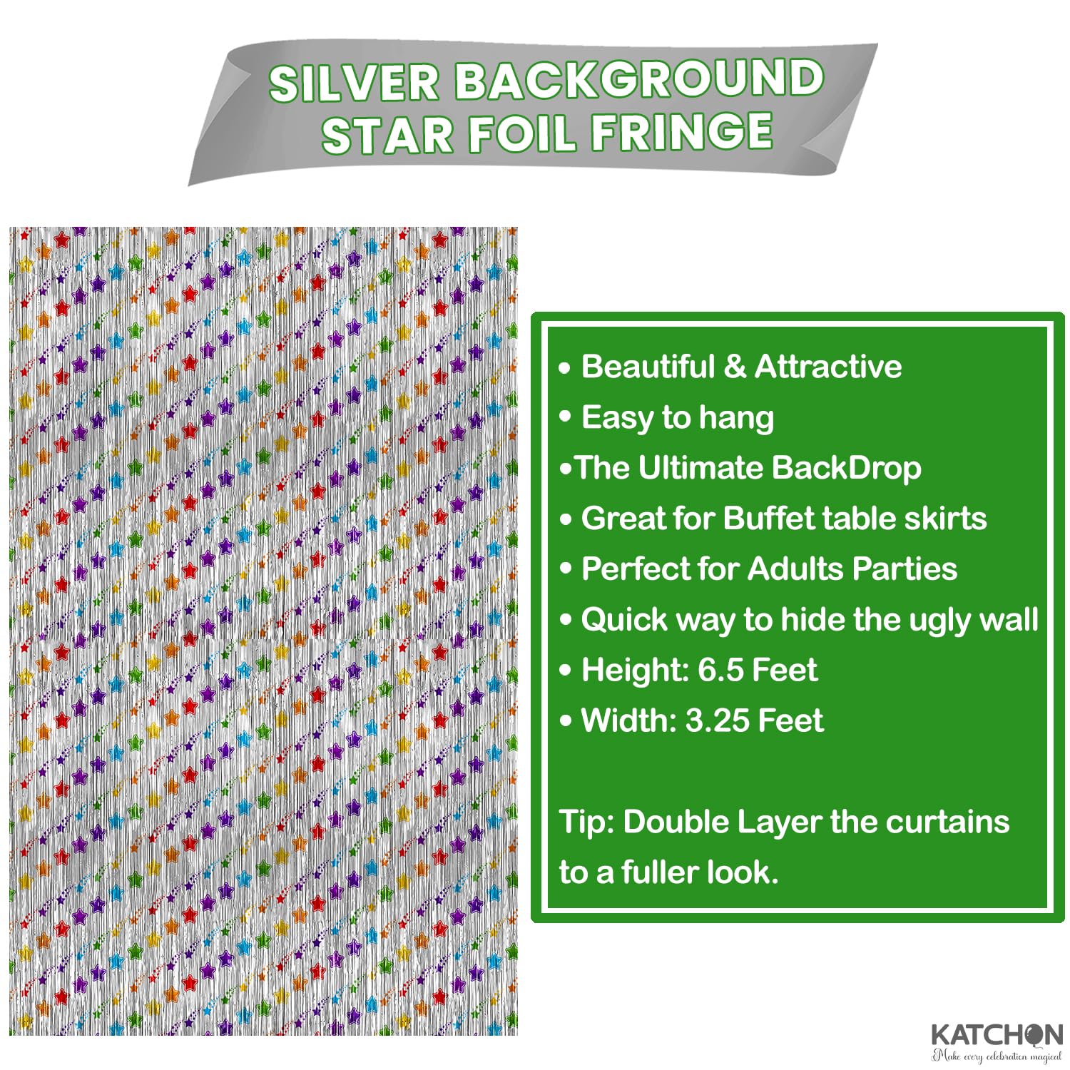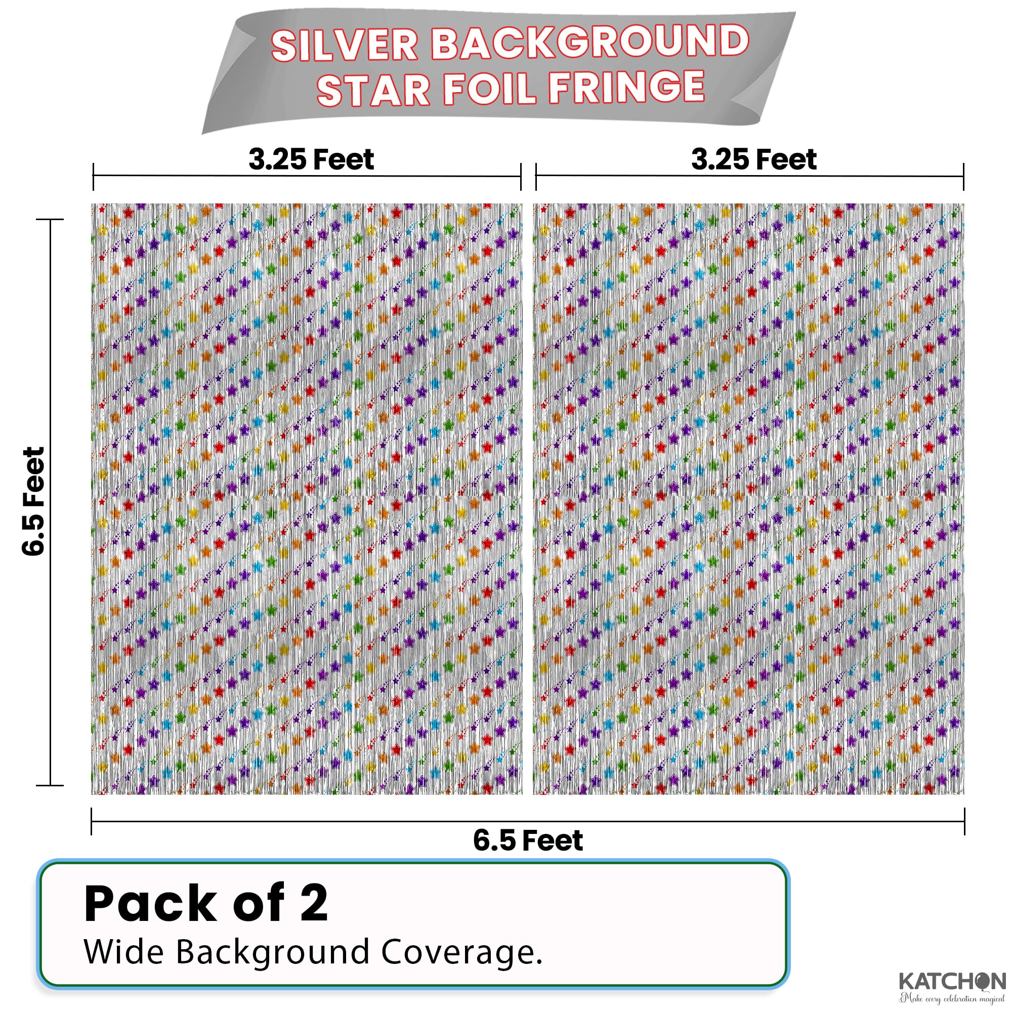 LARGE SIZE AND PACK OF 2 : This star foil fringe curtains which measures 3.2 X 6.5 and comes in Pack of 2 is made of shiny metallic silver foil with colorful stars in purple, blue, yellow, and red. Each banner measures 3.2 feet wide by 6.5 feet tall, creating a vibrant silver fringe backdrop that’s ideal for silver party decorations, silver shimmer wall backdrop, silver photo backdrop, birthday party decorations, or silver backdrop for parties, Labor Day Decorations, and more. Also works beautifully as a silver backdrop or silver backdrop curtain for themed setups.
