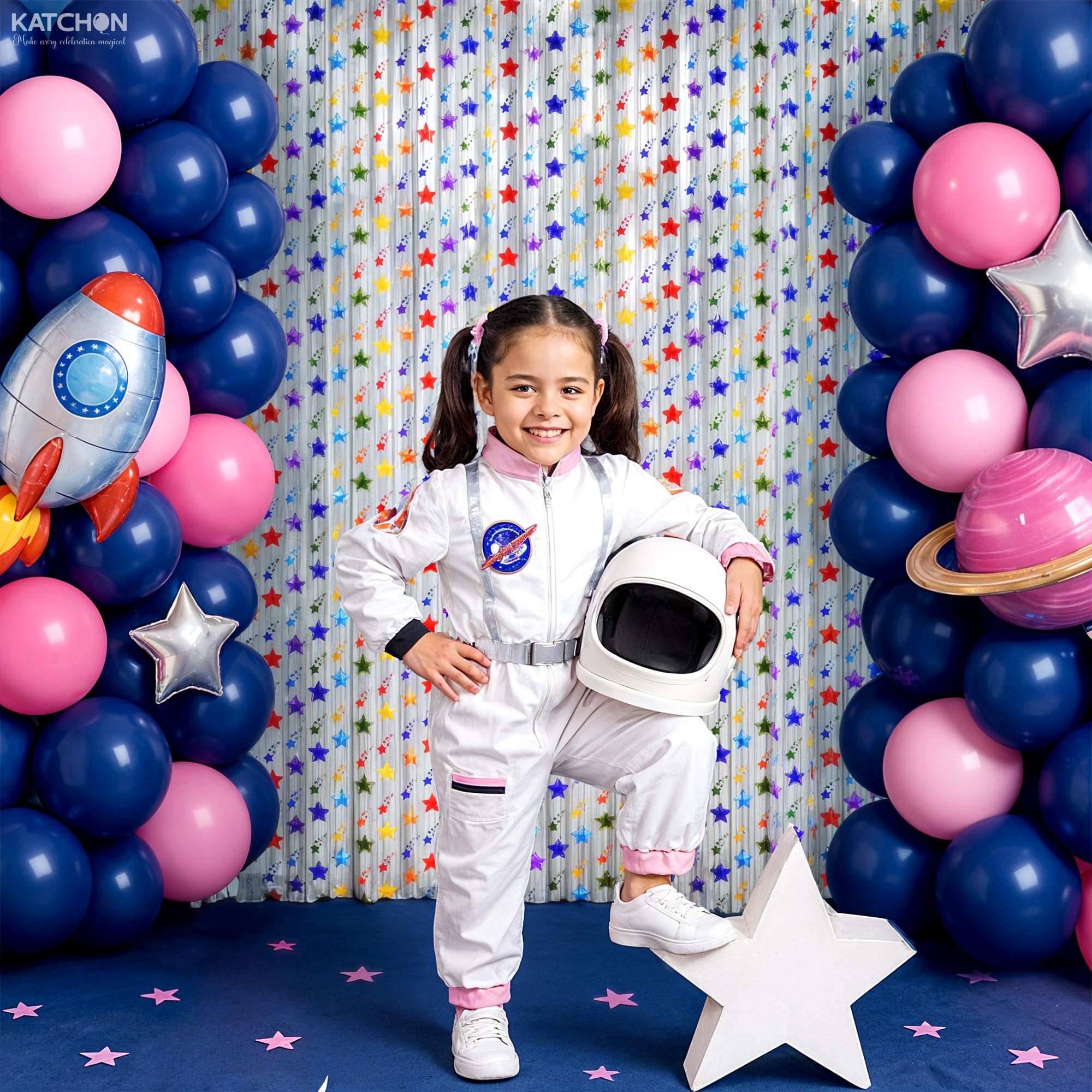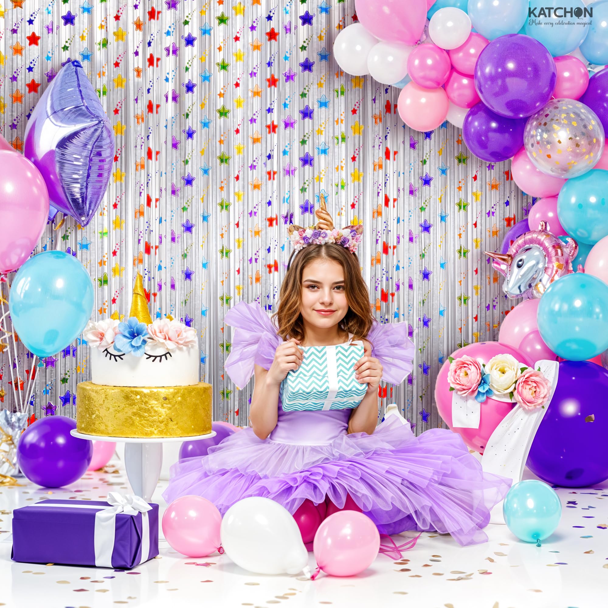Bring sparkle and color to your party setup with KatchOn’s Star Foil Fringe Curtain Pack of 2. Each curtain measures 3.2 feet wide by 8 feet tall, featuring shiny silver foil with colorful star accents. Whether you’re decorating for a kids’ birthday party, baby shower, or bachelorette night, this starry metallic fringe creates a fun and photo-worthy backdrop. Each curtain comes with adhesive backing, so you can hang them in minutes on any wall, doorway, or window. Use them together for full wall coverage, or layer them with balloons and banners for a more festive setup. The shimmering tinsel reflects light beautifully, creating a lively effect that enhances any celebration. What you will get: 2 Pieces – Star Foil Fringe Curtains (3.2 ft x 8 ft each) This versatile star fringe banner works for kids’ parties, gender-neutral baby showers, bridal showers, unicorn-themed celebrations, or even as colorful playroom decor. Guests will love taking selfies in front of this shiny starry wall. Fold and store after use to bring it out again for your next party. From children’s celebrations to chic indoor parties, star foil curtain backdrop makes decorating easy, fun, and full of personality.
