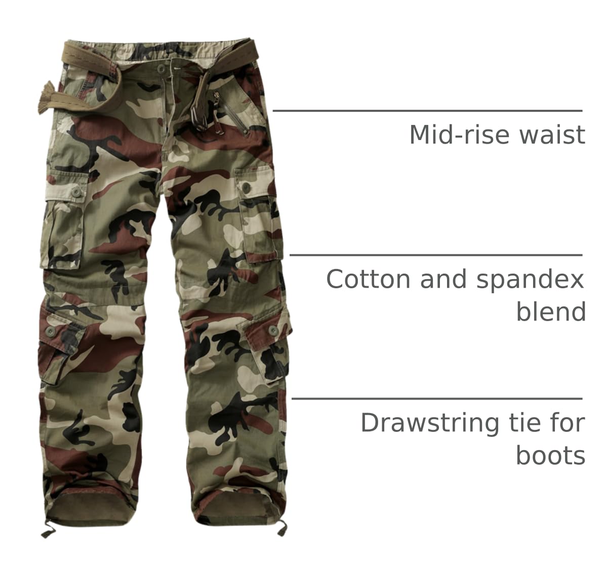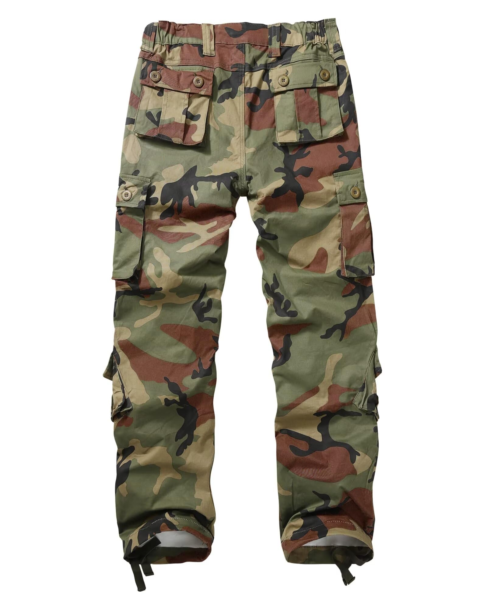 Classic camo pants with Multi-Pocket: Women casual loose pants features 8 Pockets include 2 front slash pockets; 2 Large buttoned cargo pockets; 2 Leg buttoned Pockets; 2 rear buttoned pockets. Plus 1 left front zipper pocket can be hold cards