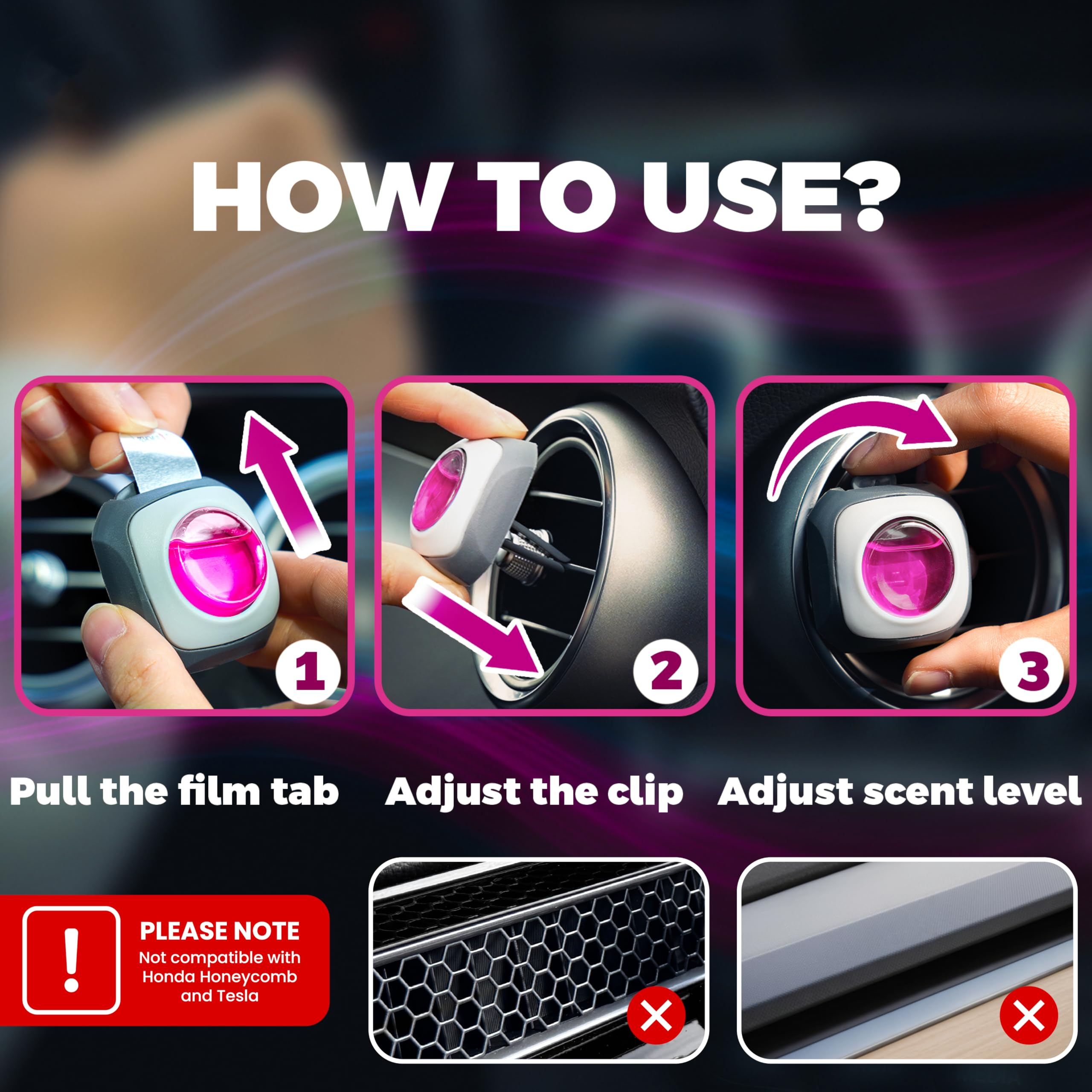 Features a 3-level scent control so you can choose your preferred fragrance intensity. The car air freshener vent-clip design attaches securely and fits most standard vehicle air vents for simple, convenient use; A great car accessory
