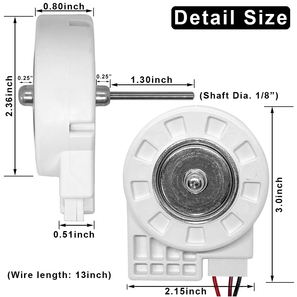 Premium Quality: The 12V freezer fan motor is made of high-quality metal and plastic and well-tested by the manufacturer, Ensure long-lasting and effective performance. 3Pin Three wires prongs plug (black-, red+ and purple is feedback) attached to the motor, Shaft effective length is 32mm (1-1/3") , shaft diameter is 3.16mm(1/8"). the motor diameter is 60mm (2-3/8").