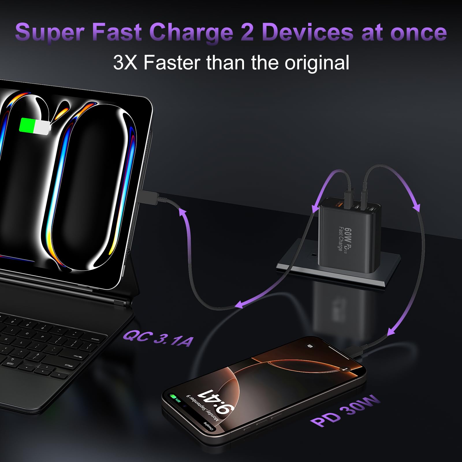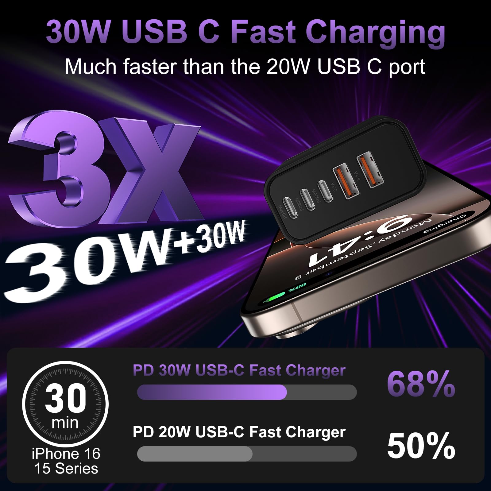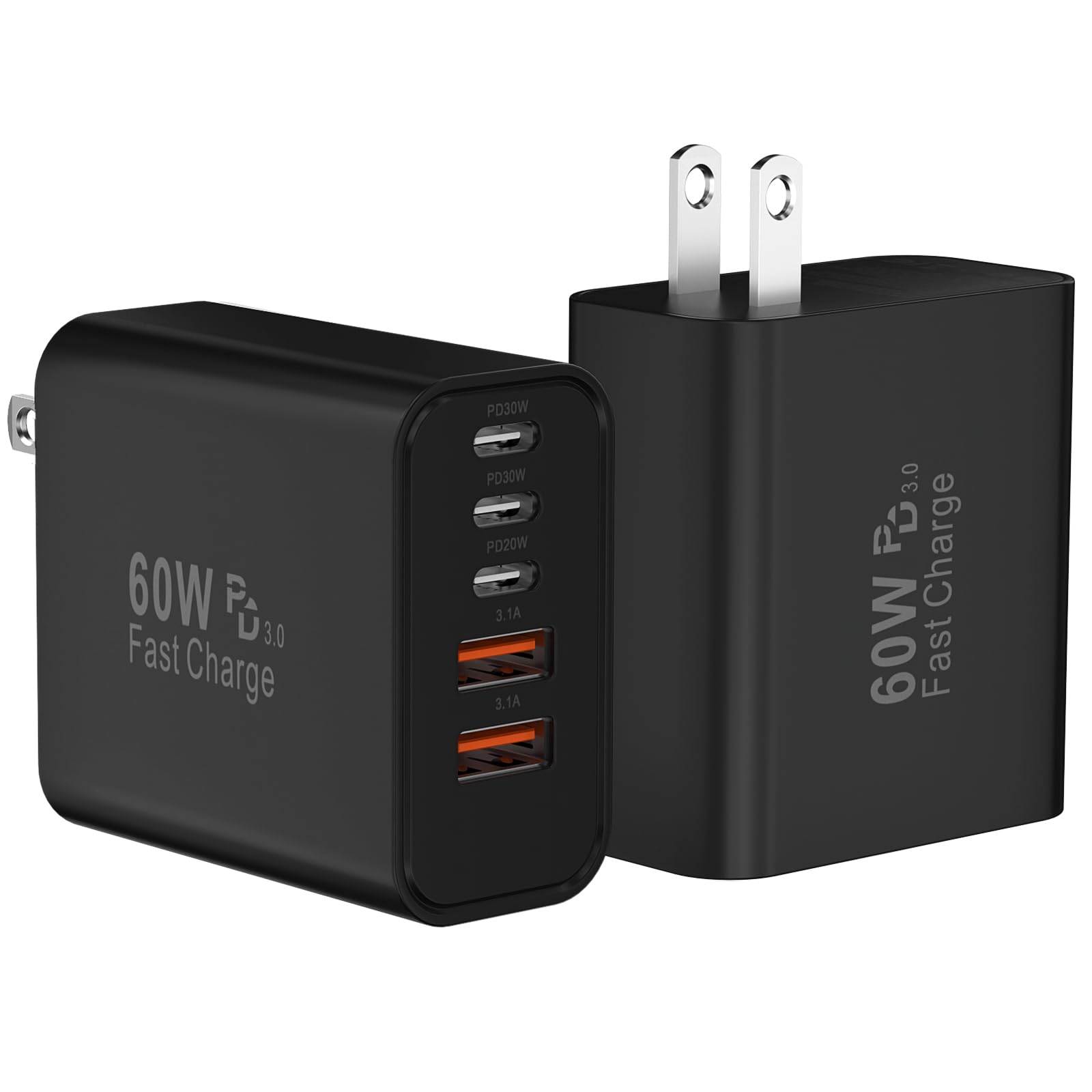 2-Pack 60W USB C Charger Fast Charging Blocks: Auorld 60W USB C Fast Charging Blocks support the Power Delivery and Quick Charge 3.0 fast charging functions with a total power of up to 60W. The USB-A port offers an output power of 3.1 A/5 V, while each USB-C port provides Max 30W output power, charge your Phone 16 15 Pro Max up to 65% in just 30mins, 10% faster than the original 20W USB C charger