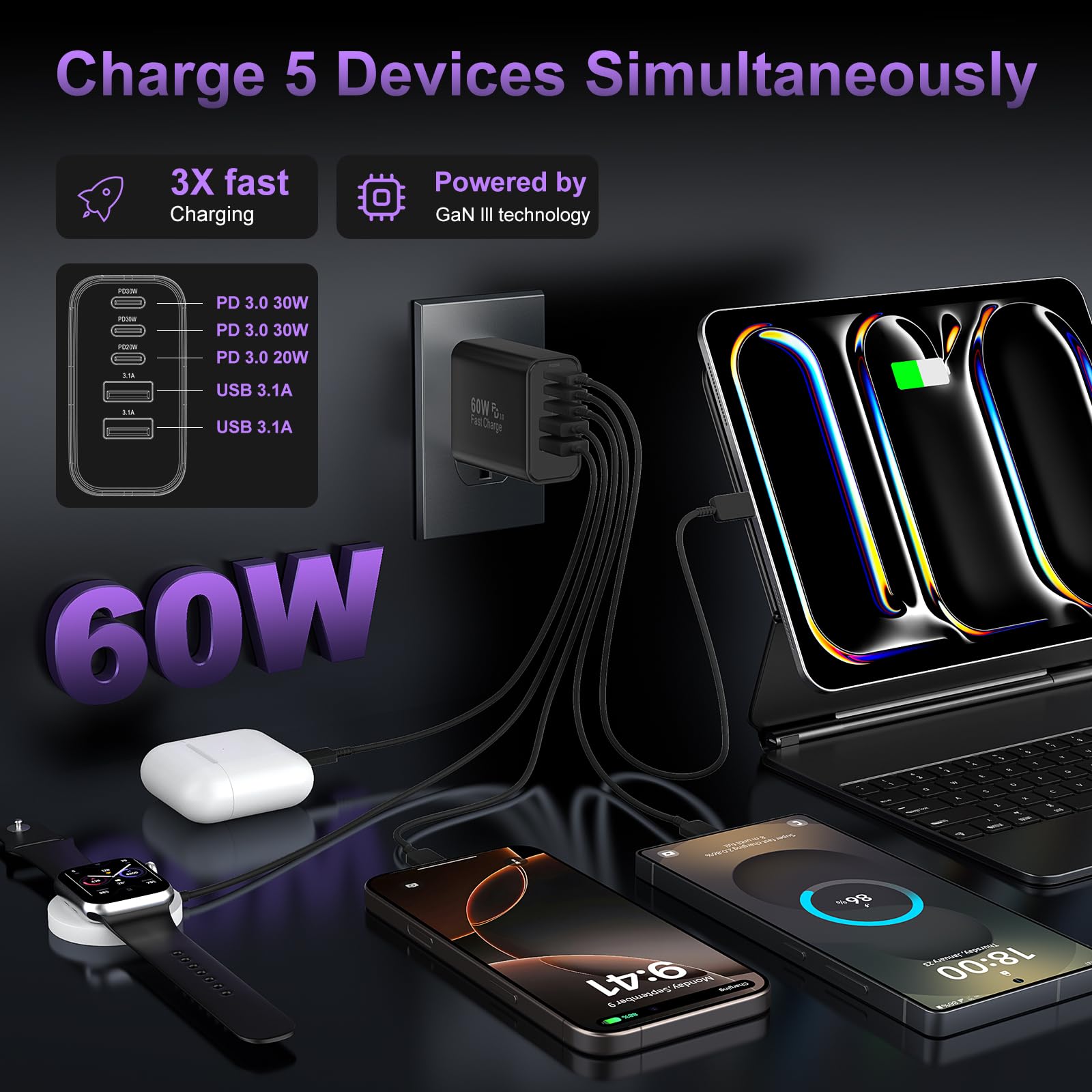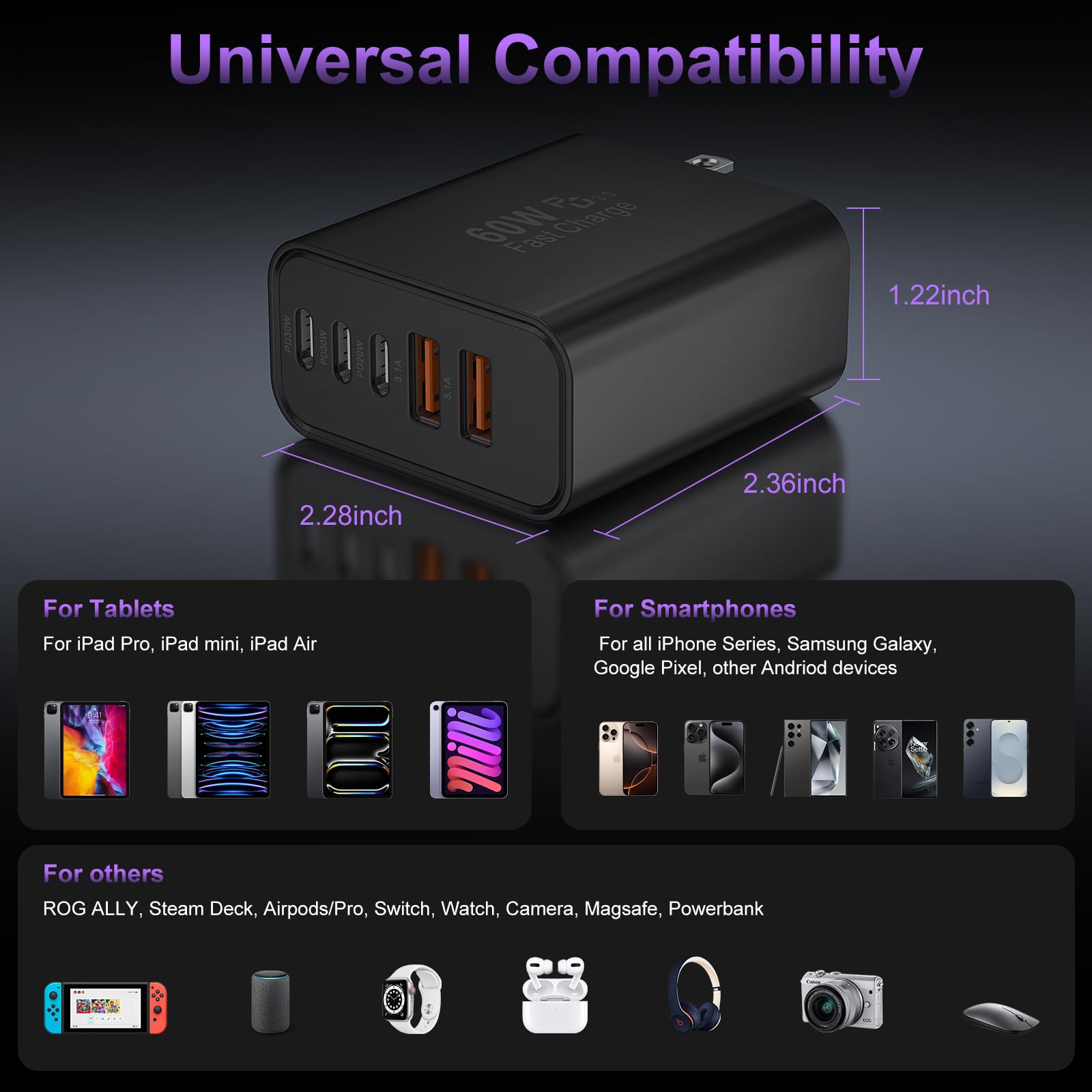 5-IN-1 High Speed Charging Cube for Multi Devices: with 3 USB-C ports and 2 USB-A ports, the newest wall charger brick can fast charge 5 devices simultaneously for efficient power distribution, such as phones, tablets, cameras, power banks, headphones, smartwatches, Swtich etc. One for all, save your outlet space instead of occupying 5 wall sockets. It is the best replacement for your original USB chargers