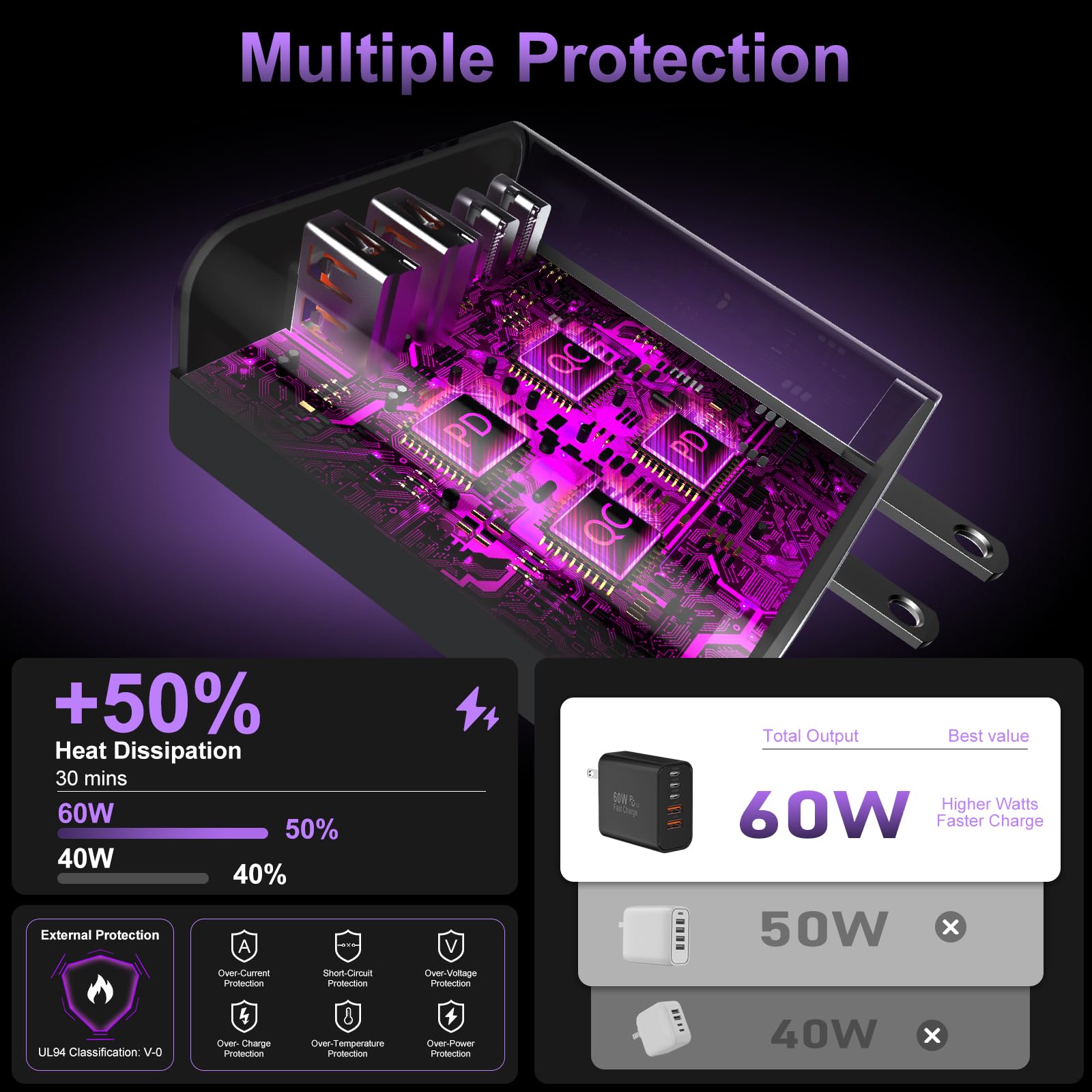 Safety and Reliable Multiple Ports Charging Blocks: The USB C Wall Plug prioritizes safety with its comprehensive protection system, guarding against over-voltage, over-charge, and over-heating. Equipped with advanced smart chips, it intelligently adjusts the current to match your device's needs, guaranteeing a rapid and secure charging process. GaN technology makes our latest charger smaller without sacrificing a drop of power, improves charging efficiency greatly and prevent the phone from overcharging and overheating