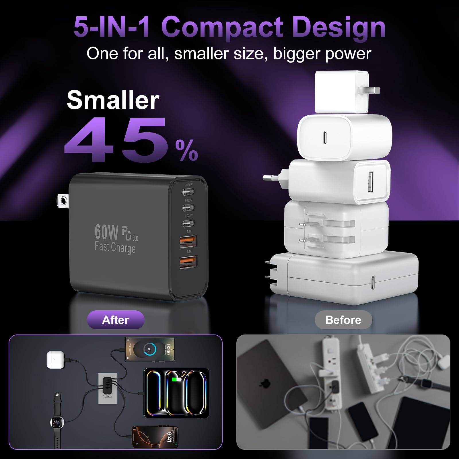 Compact and Portable Phone Charger Brick: Designed with the pocket-friendly compact body and 5-port charging cube, the USB C box is integrated to charge multiple devices at home, office and travel. Small size saves you space and fits perfectly into pockets, handbags, travel cases. Packaged with dual 60W 5-port usb c wall chargers (cable not included). If you have any problems with the c type charger block, please contact us