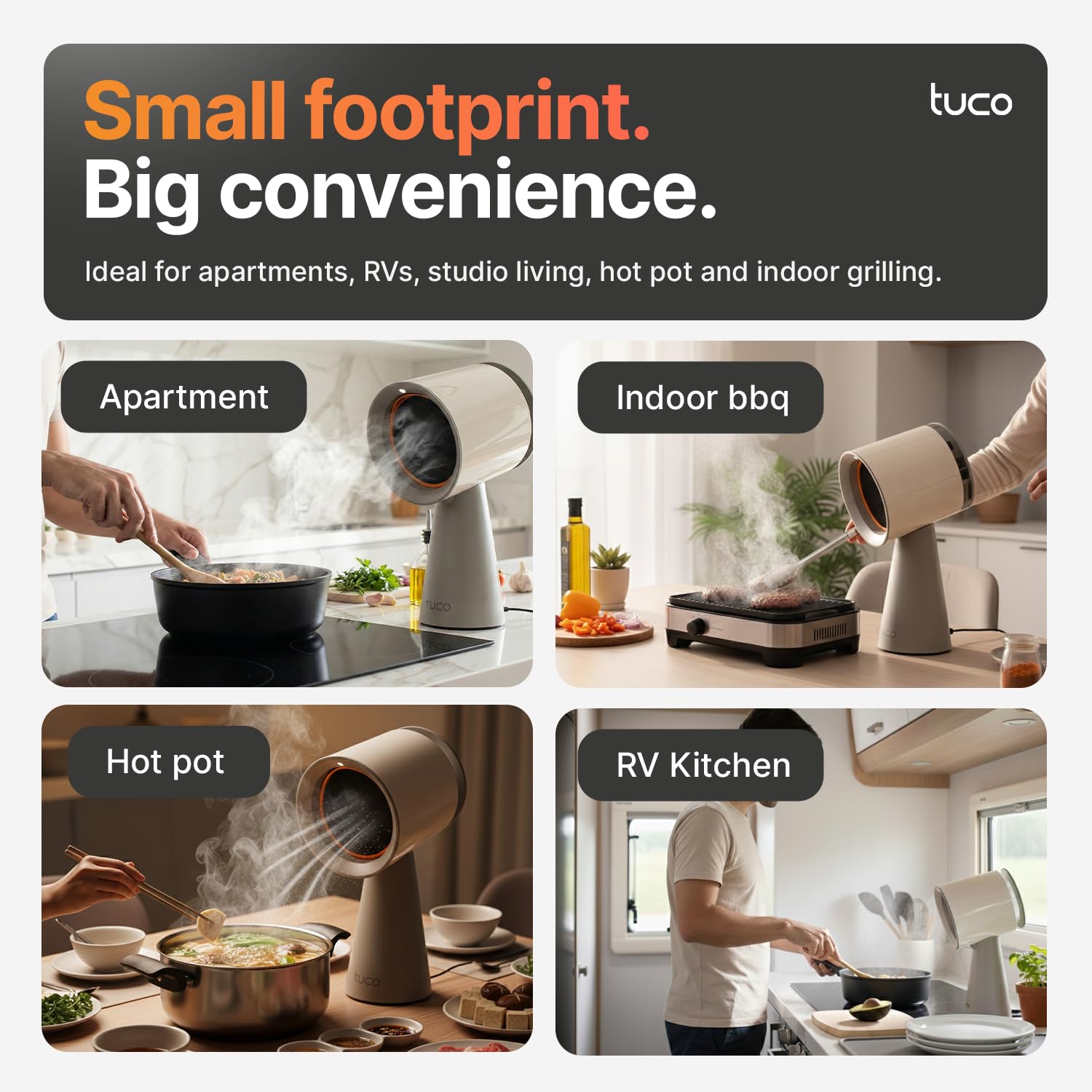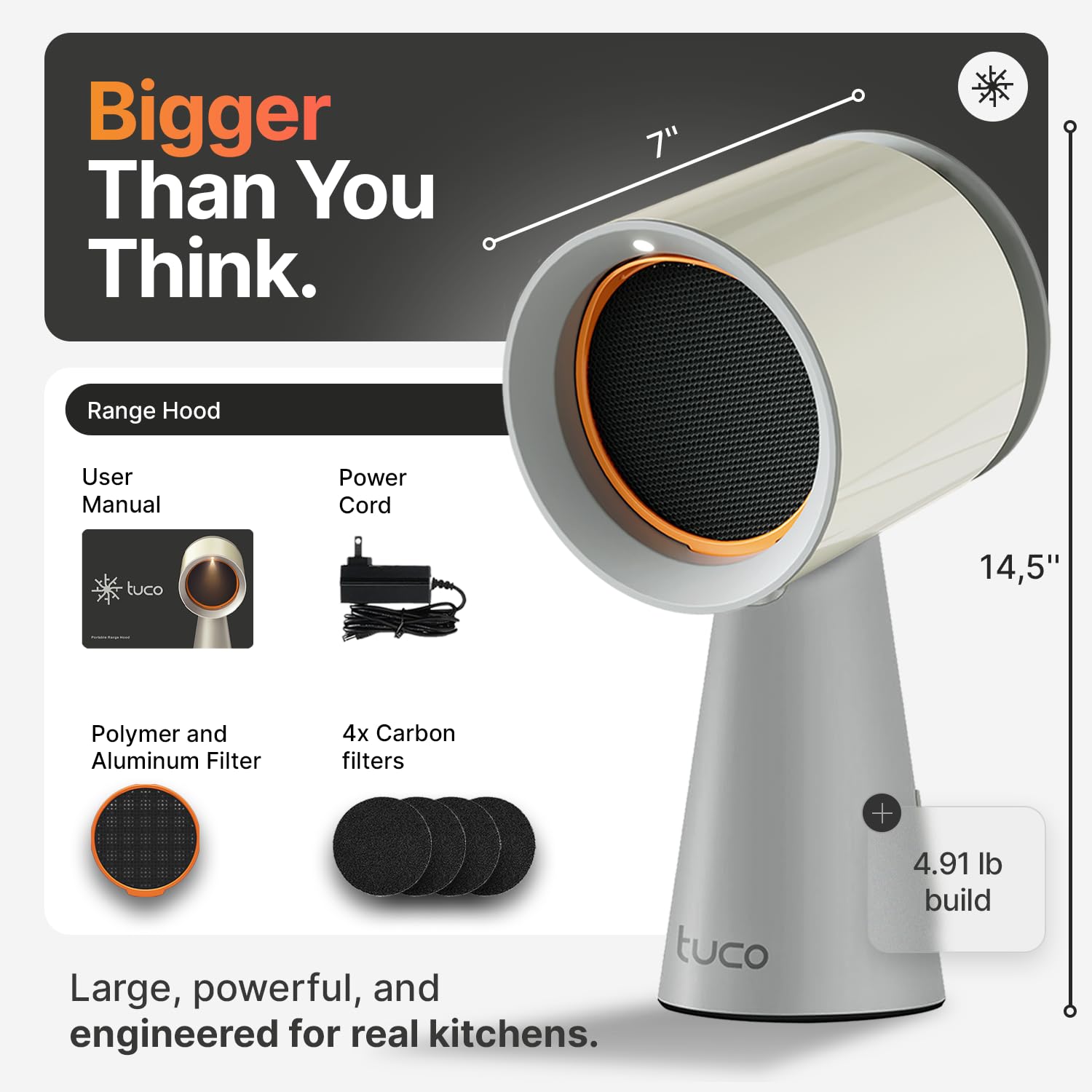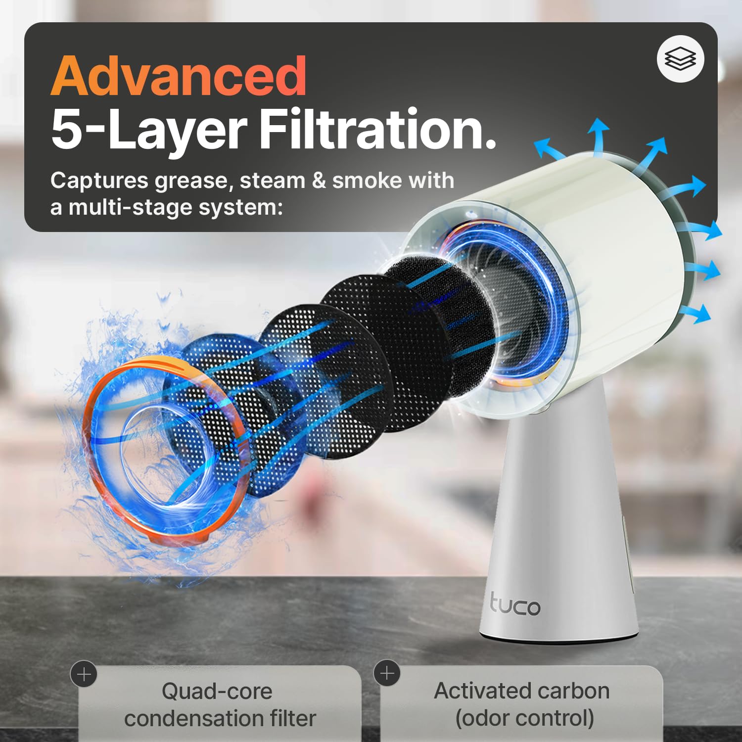 ๐๏ธ TRIPLE FILTER: The TUCO Portable Kitchen Exhaust Fan features 1) Polymer filter, 2) Aluminum alloy condensation net, and 3) Activated carbon filter. This advanced filtration system effectively absorbs most oil vapors, helping to keep your cooking environment cleaner and more pleasant.