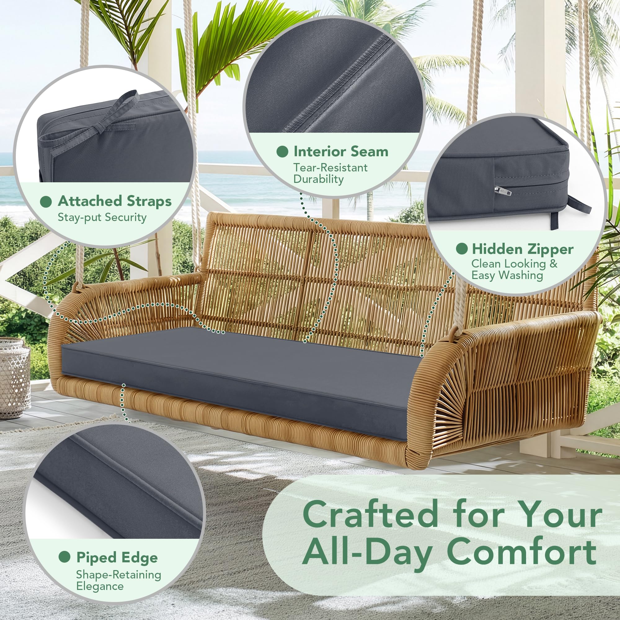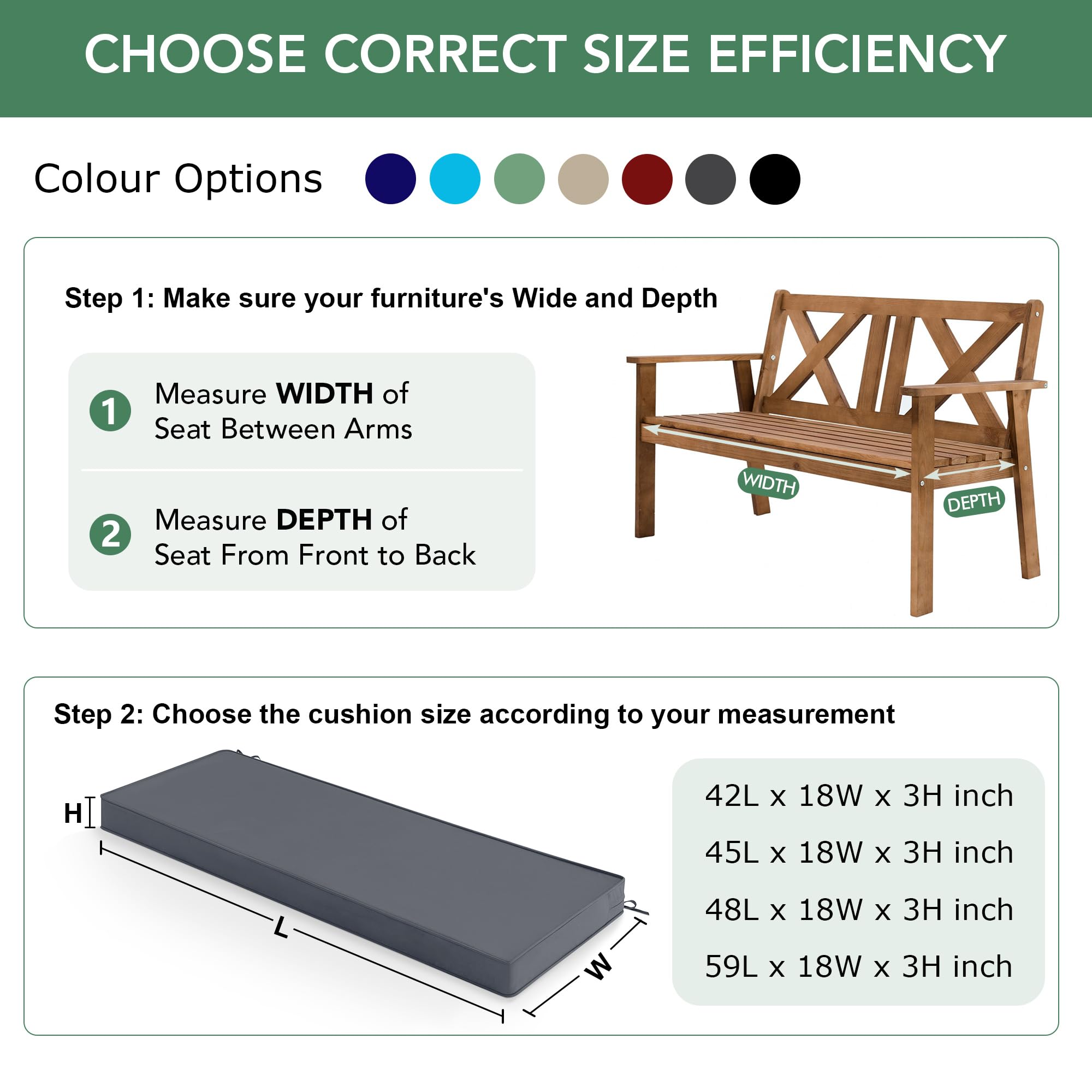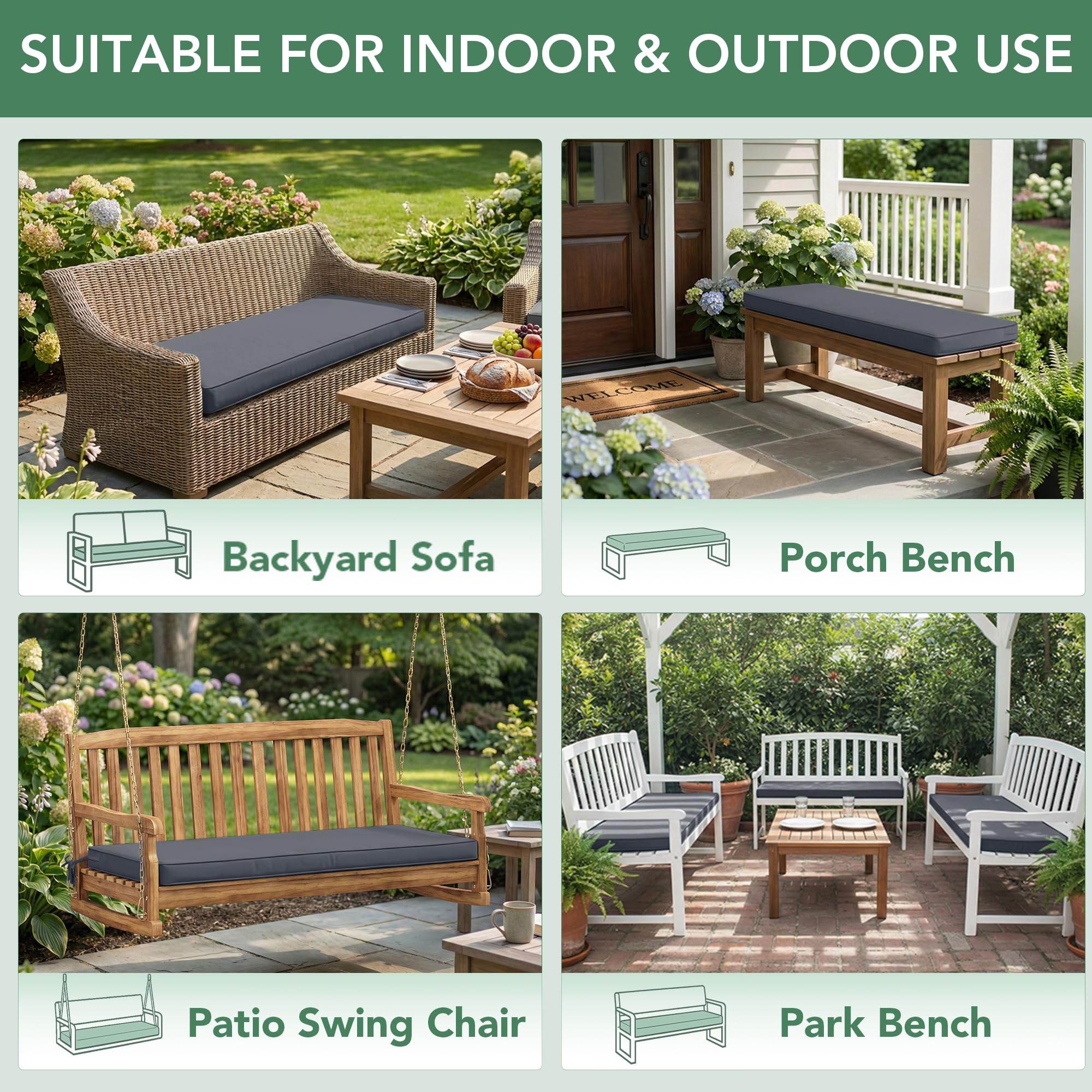 Versatile & Ideal for Multiple Settings: Whether you're relaxing on a garden bench, enjoying your porch swing, wooden swing, loveseat, sofa, or lounger on patio furniture, our patio cushions for metal bench adds comfort and style to any outdoor seating. Its neutral color options - Navy blue, Beige, Dark Grey, Red, Sage Green, Teal, and Black - are designed to match a variety of outdoor decors.
