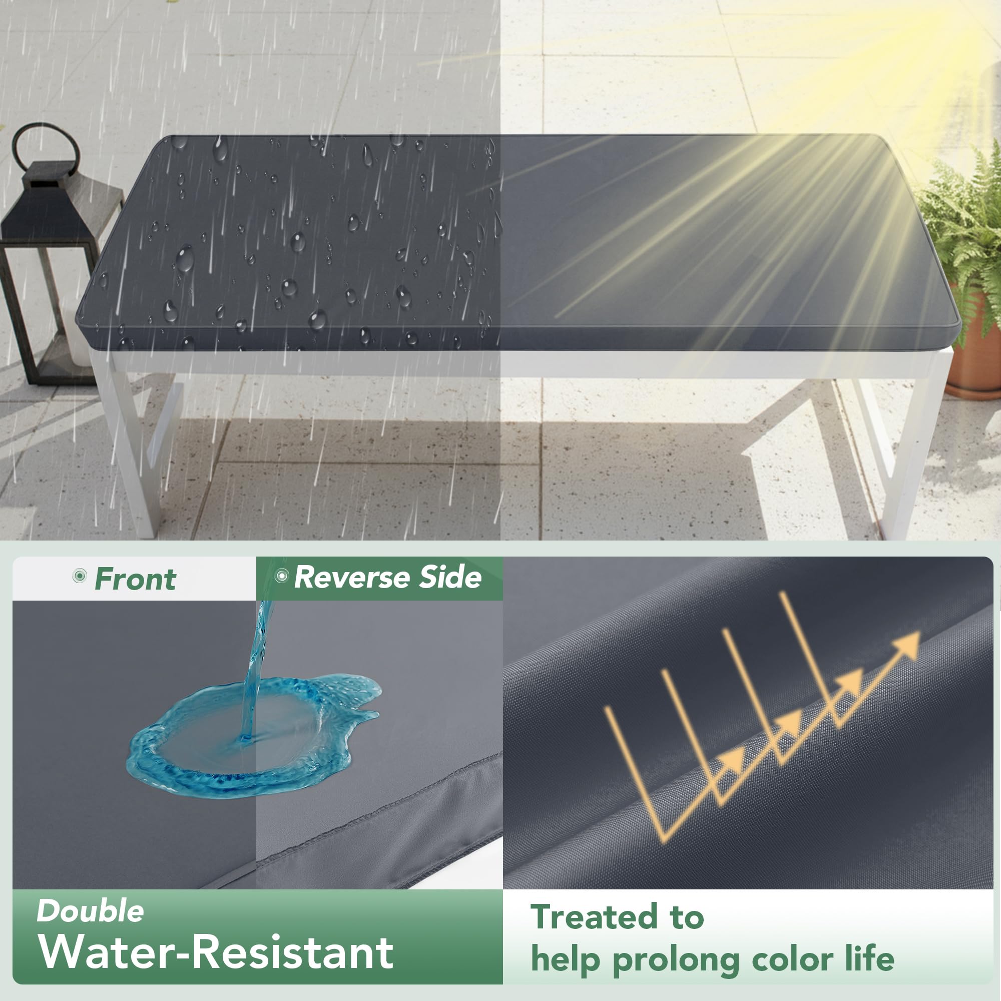 Waterproof & Colorfast: Crafted from high-quality 250gsm polyester fabric, this premium outdoor bench cushion are designed to withstand the elements. The weatherproof fabric keeps your cushion dry and protected from rain, while the anti-fading technology ensures vibrant colors even after extended exposure to sunlight.