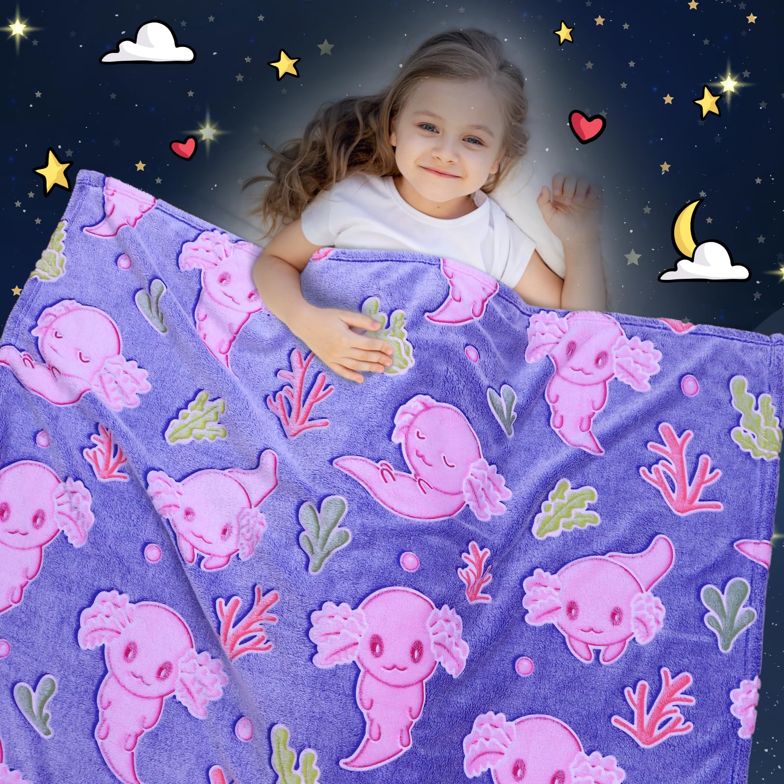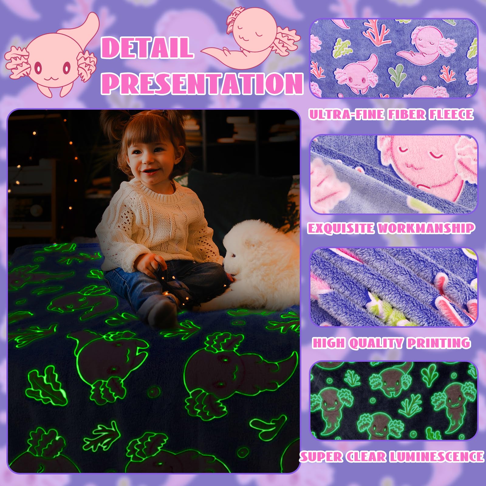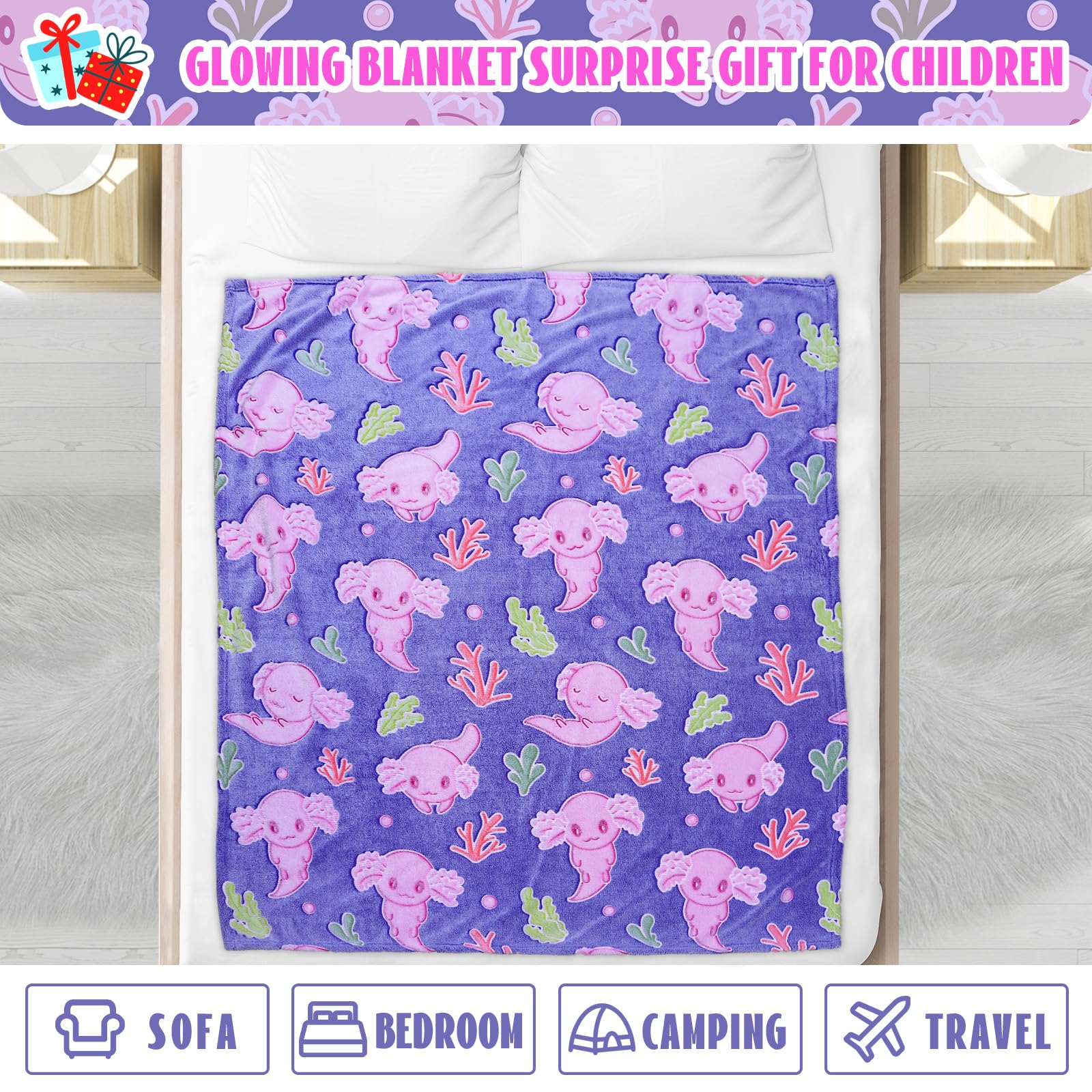 【GLOW IN THE DARK BLANKET】Our cartoon axolotl blankets are made of safe and non-polluting luminous woven material. Simply expose the kid Blanket to sunlight or a bright light source for 15 minutes and it will glow for over 5 hours. The longer the exposure, the brighter the glow.