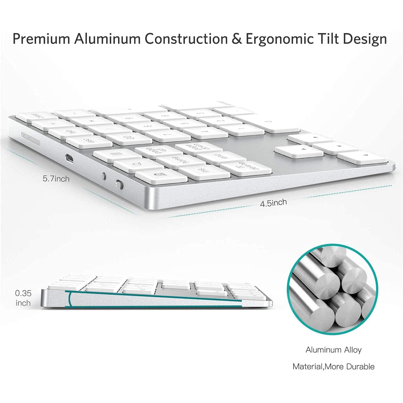 ★【Slim Aluminum Design & Ergonomic Tilt】:The bluetooth number pad is made of solid and premium aluminum materials for long-lasting use. The ergonomic tilt ,comfortable typing precise control, good resilience fast response for comfortable typing and good look, slim style appearance ,only 0.45lb, 5.7*4.5*0.35 inch.Perfectly matches your Notebook, Macbook Air/Pro, iMac, iPad, laptop or desktop as the side external numeric keypad.