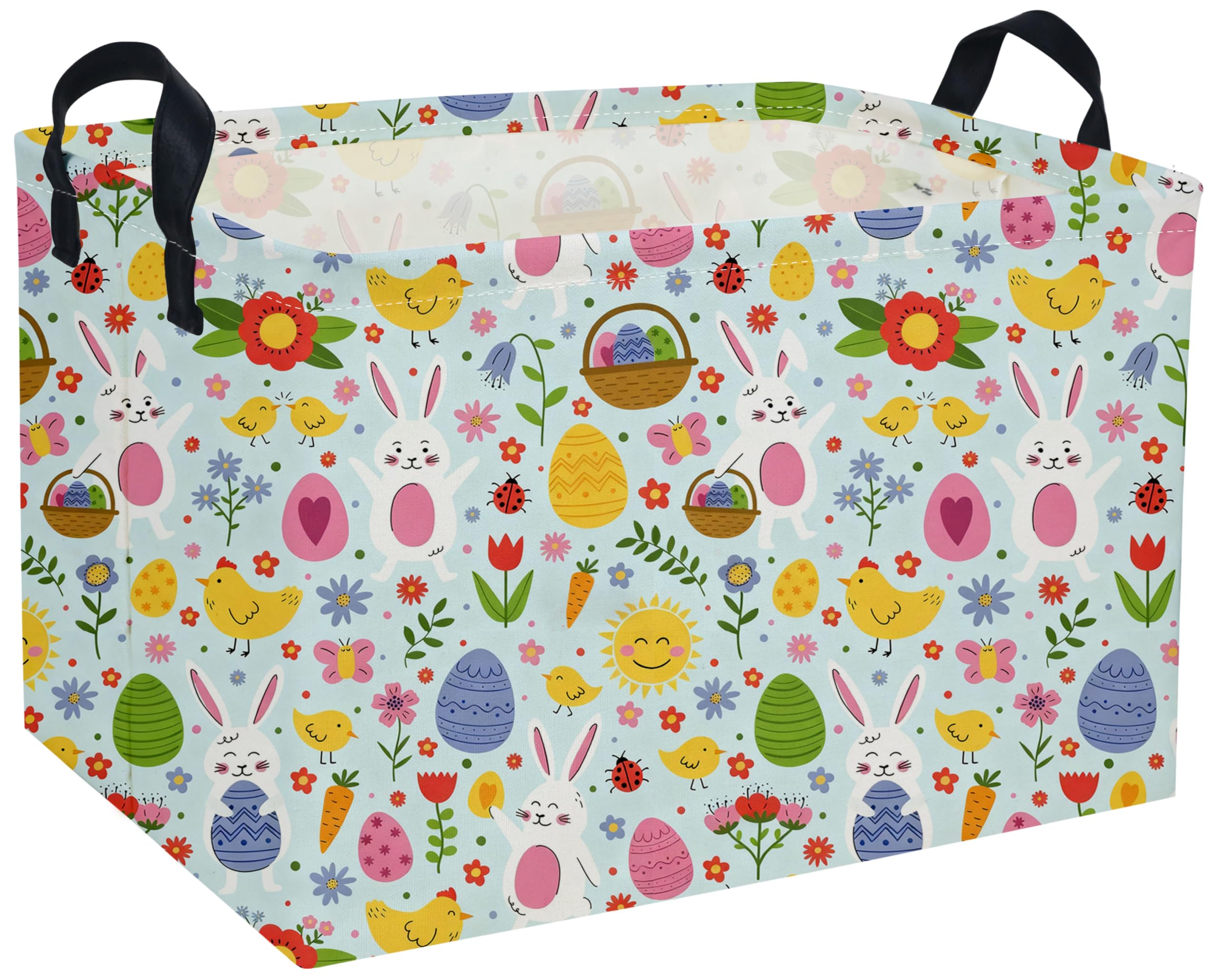 MATERIAL:The easter t basket is made of durable canvas &The inner lining is made of waterproof fabric; sturdy metal rod frame around the top keep the basket shape.