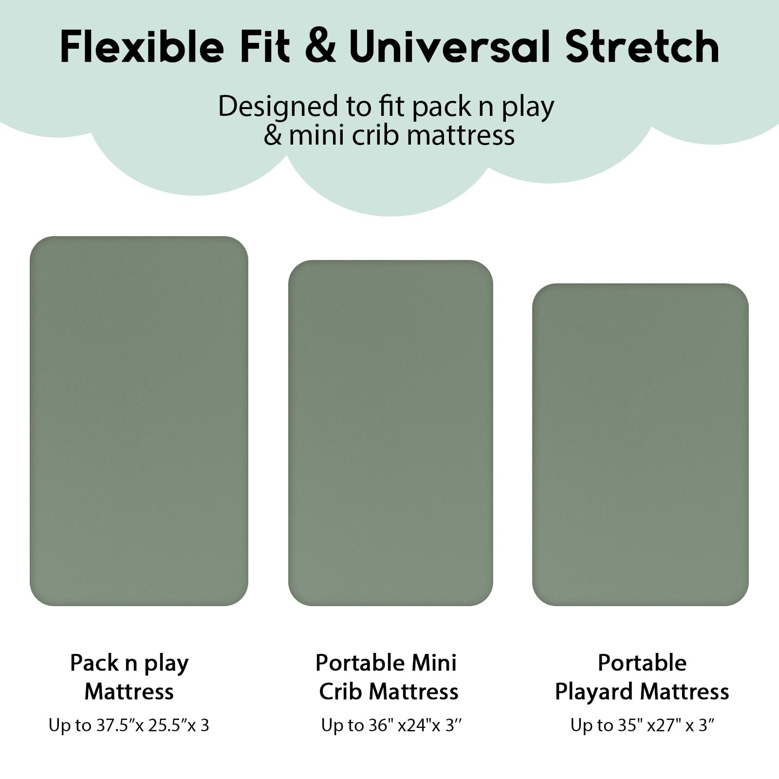 PERFECT FIT: Measures 38”X 26”, our mini crib sheets for playard can snug fit most pack n play mattresses, portable play pens, and mini crib mattresses. 5'' deep pocket provides a safe and secure 360 degree coverage and protection for your luxury mattress.
