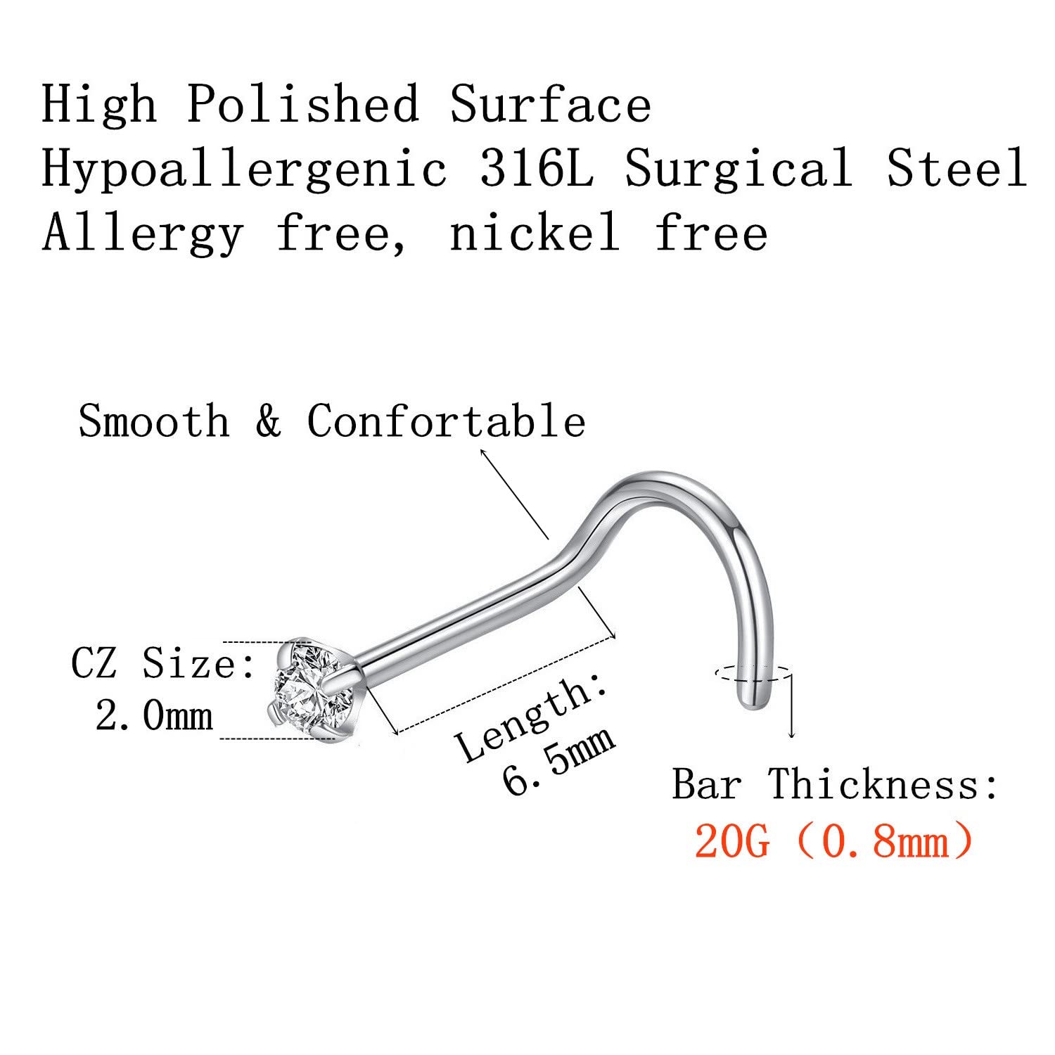 Quantity: 6pcs 2.0mm CZ screw nose rings. This screw nose ring for women size: Bar thickness: 20 gauge (0.8mm), Pin Length:6.5mm, Prong set cubic zirconia: 2.0mm, These stones a very bright and prong set by hand for accuracy.