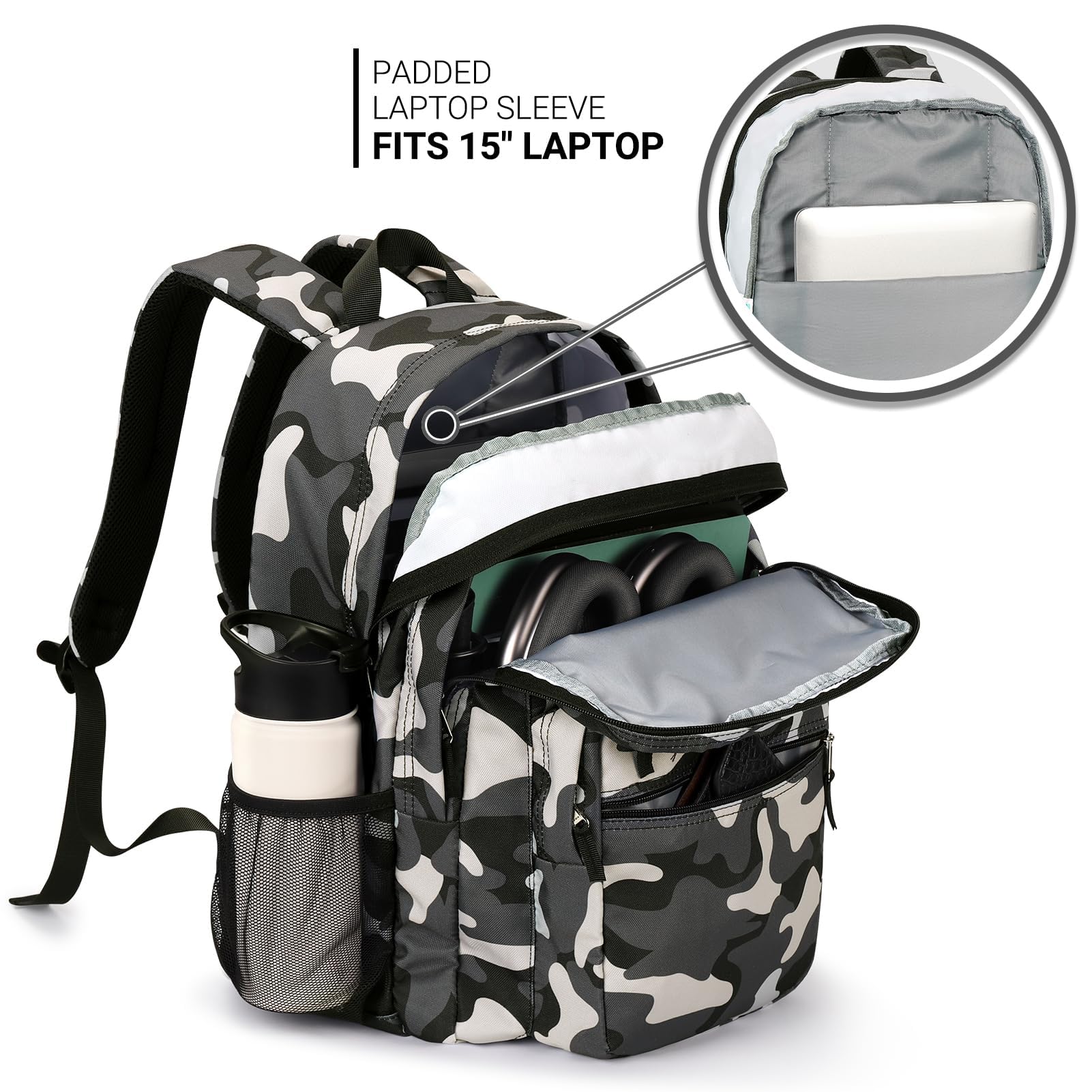 Convenient Storage Backpack: Our unisex laptop backpack features two main compartments, including a dedicated laptop sleeve for up to 15.6" devices. It also boasts a discrete front stash pocket, a utility pocket with an integrated organizer, and an additional external zippered pouch for quick access. Plus, two side pockets accommodate various water bottle sizes.