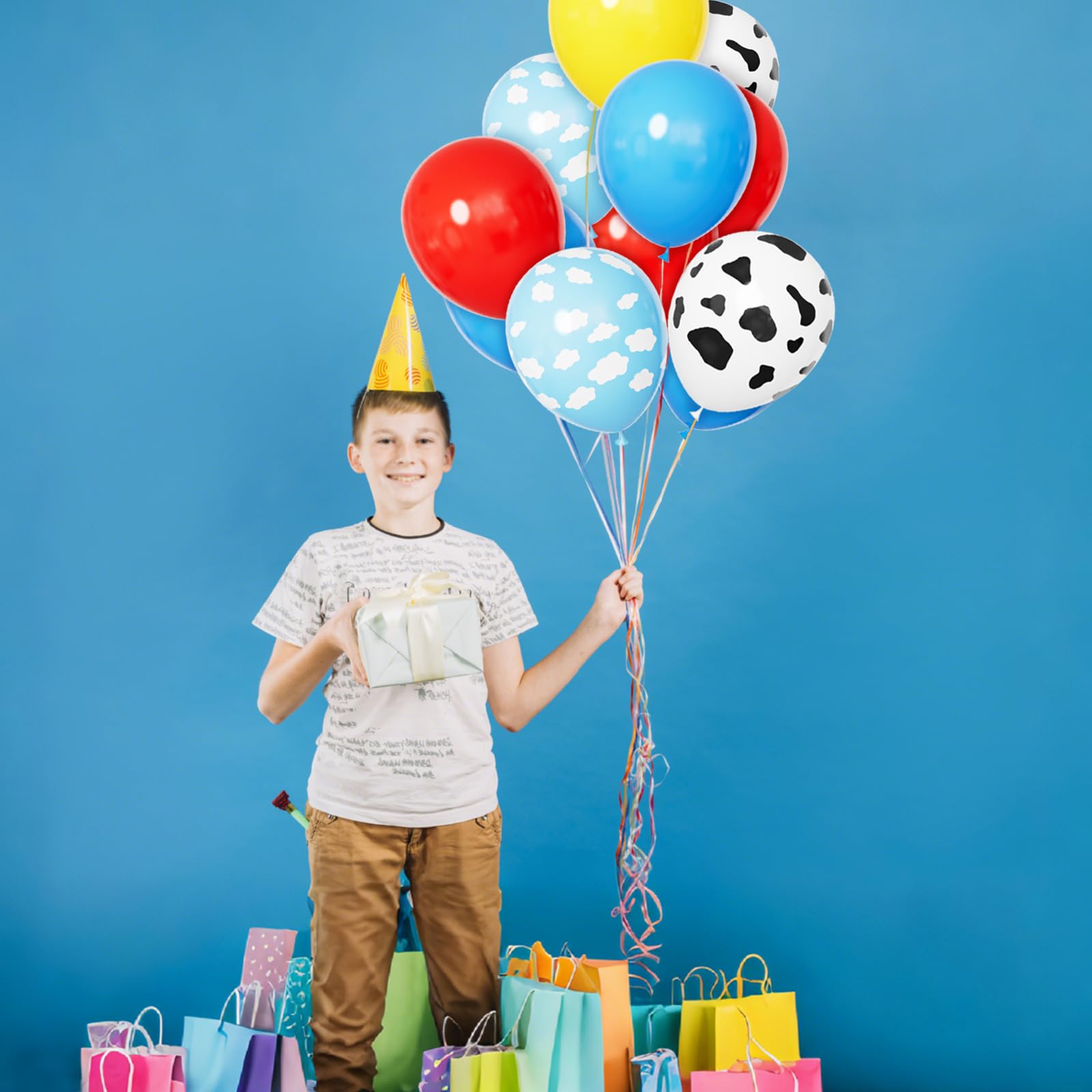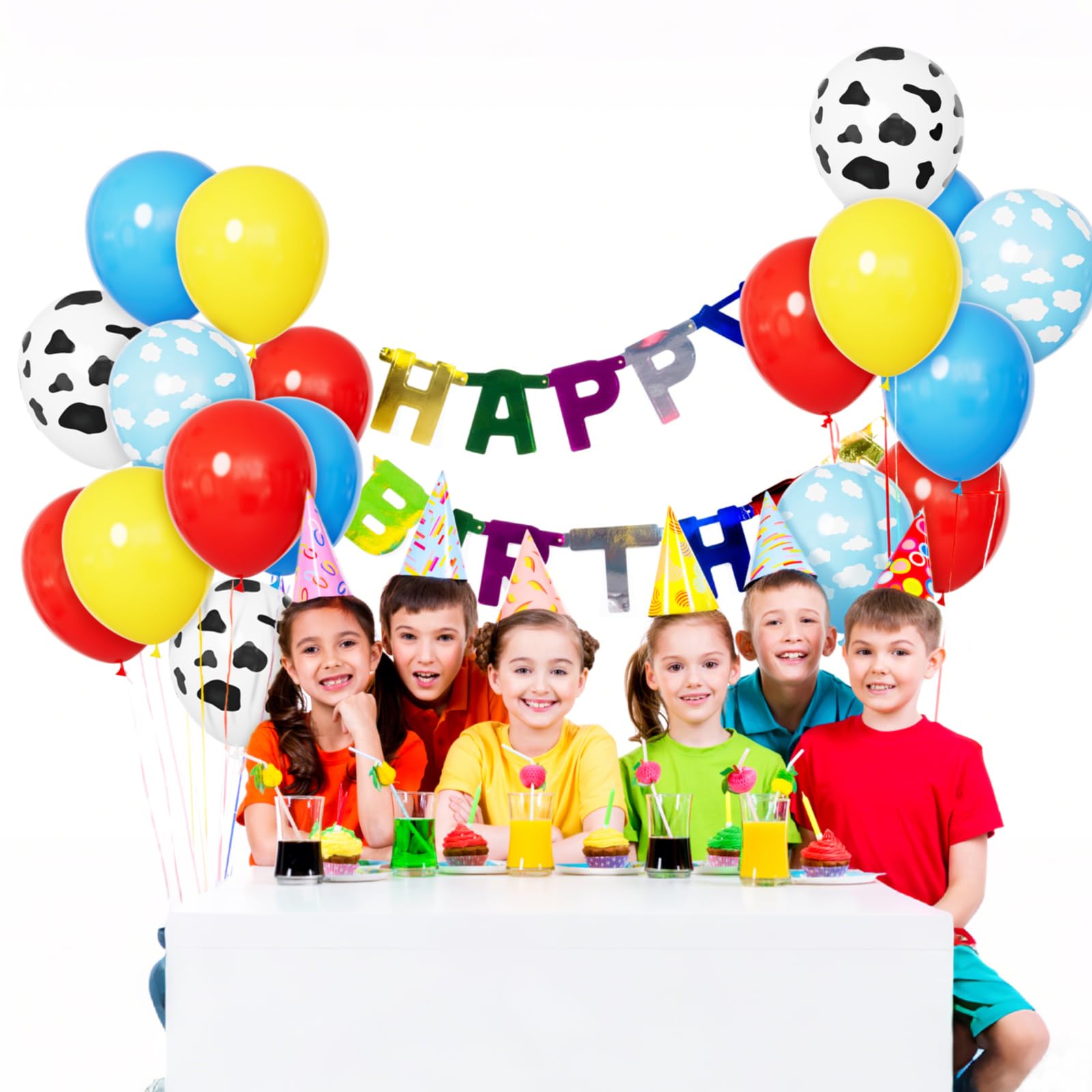 【Balloons Packing 】12 Inch balloons pack: Package includes 16 pcs light blue balloons, 16 pcs red balloons, 16 pcs yellow balloons,10 pcs cow balloons and 10 pcs could balloons with 2 ribbons.