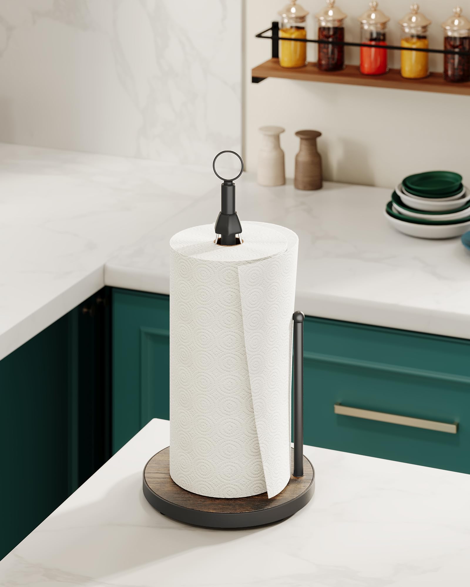 Charming Farmhouse Style - Elevate your kitchen decor with our paper towel holder that boasts a heavy-duty wood base featuring a rustic wood grain finish. It's the perfect blend of functionality and farmhouse elegance to complement your kitchen's aesthetic.