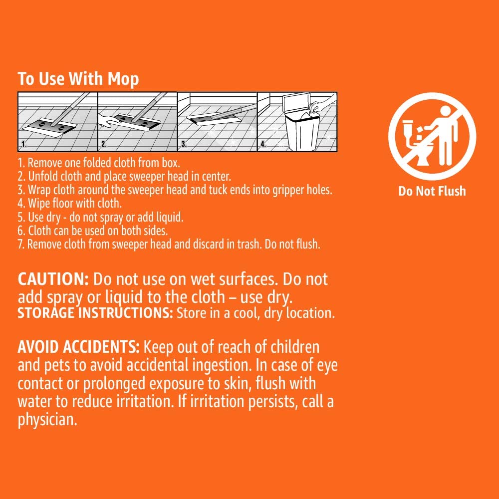 Amazon Basics Heavy Duty Dry Floor Cloths are designed to trap dust, dirt, and pet hair, offering a quick and convenient way to handle your sweeping needs. Compatible with the Swiffer® Sweeper® system. Use in place of brooms. Use dry, safe for all floor types. Do not use on wet surfaces. Do not add spray or liquid to the cloth. Store in a cool, dry location. Discard in Trash - Do Not Flush. *All product and company names are trademarks ™ or registered ® trademarks of their respective holders. Use of them does not imply any affiliation with or endorsement by them.