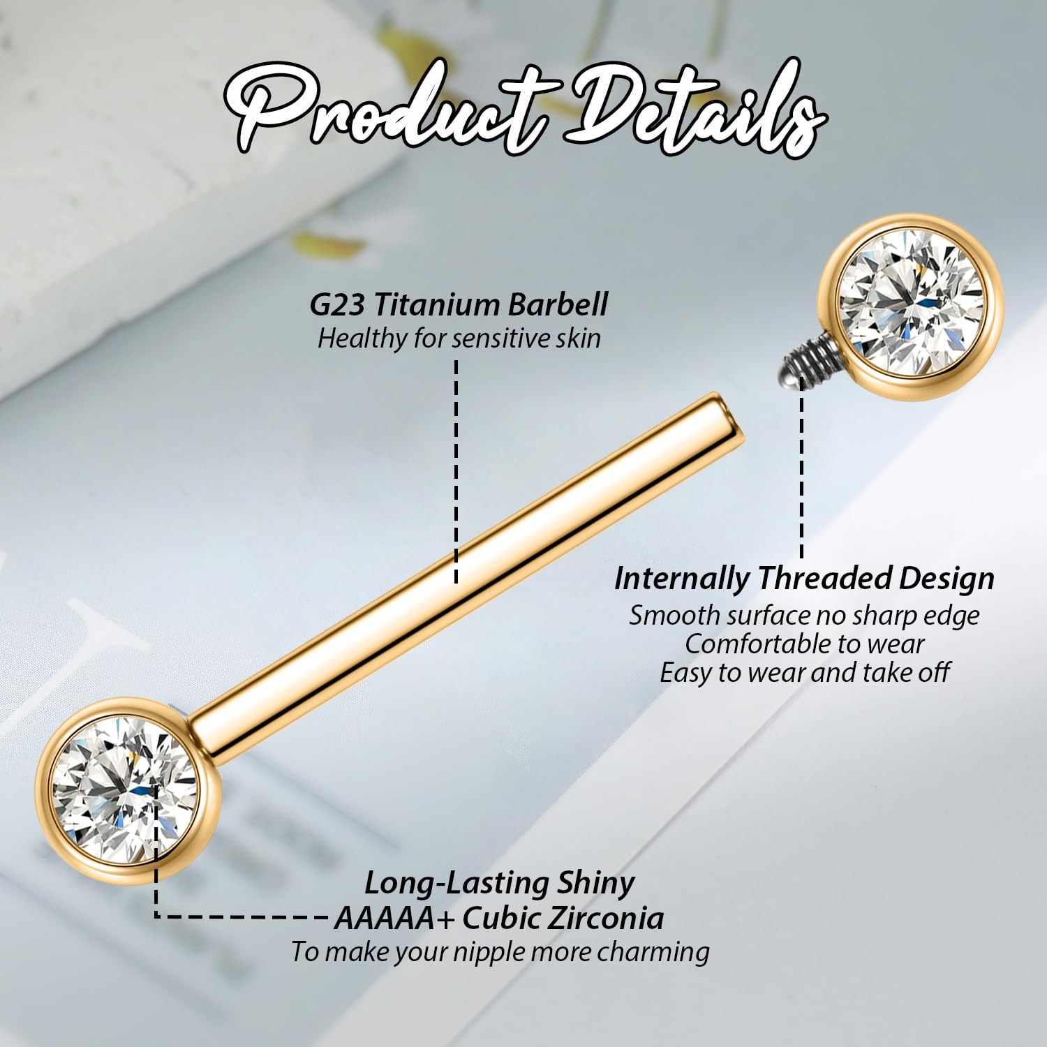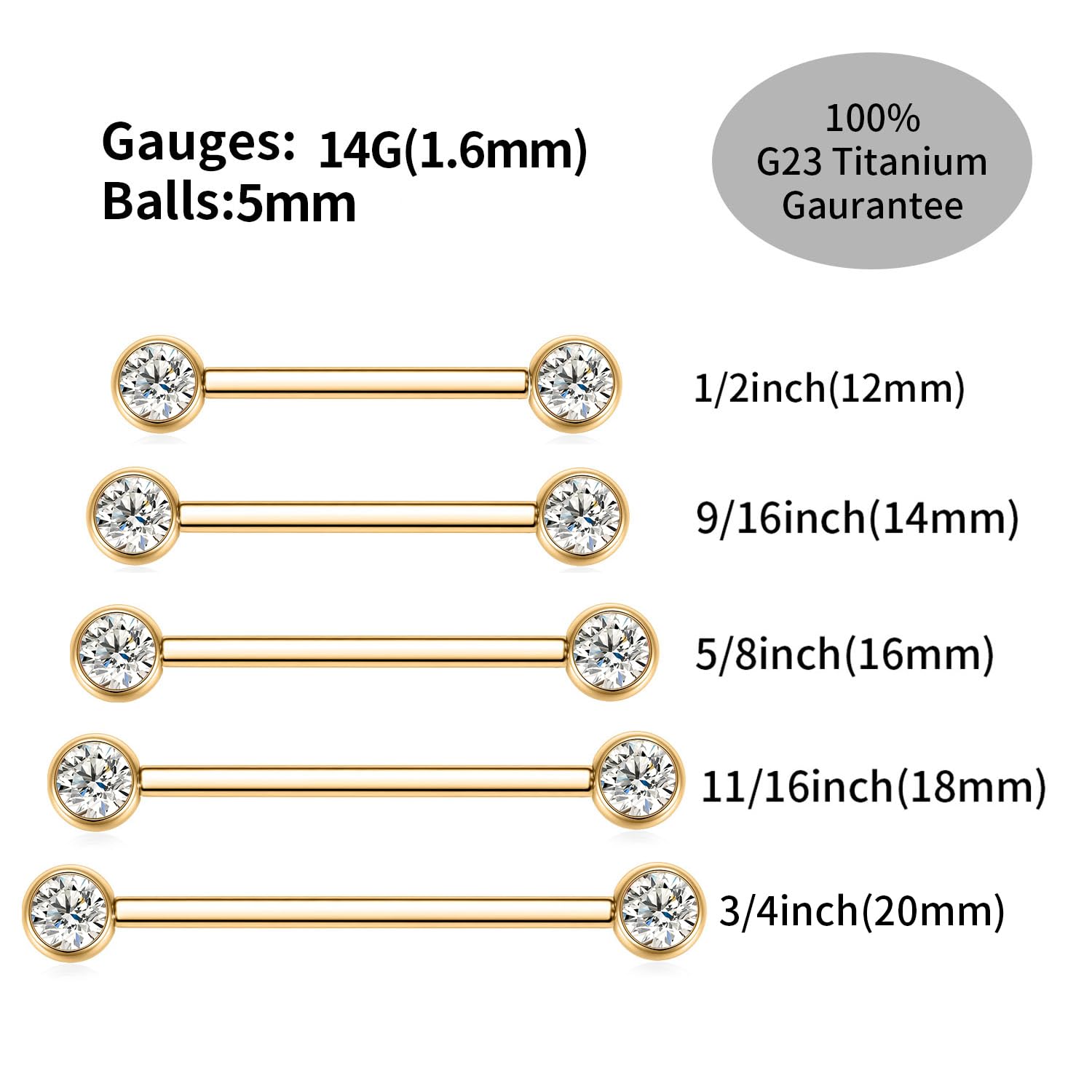 Size and Color: Gauge: 14 G (1.6 mm); Nipple Barbell Length: 5/8"(16 mm); CZ Size: 5 mm. Color: gold with CZ. 1 pair nipple ring per order