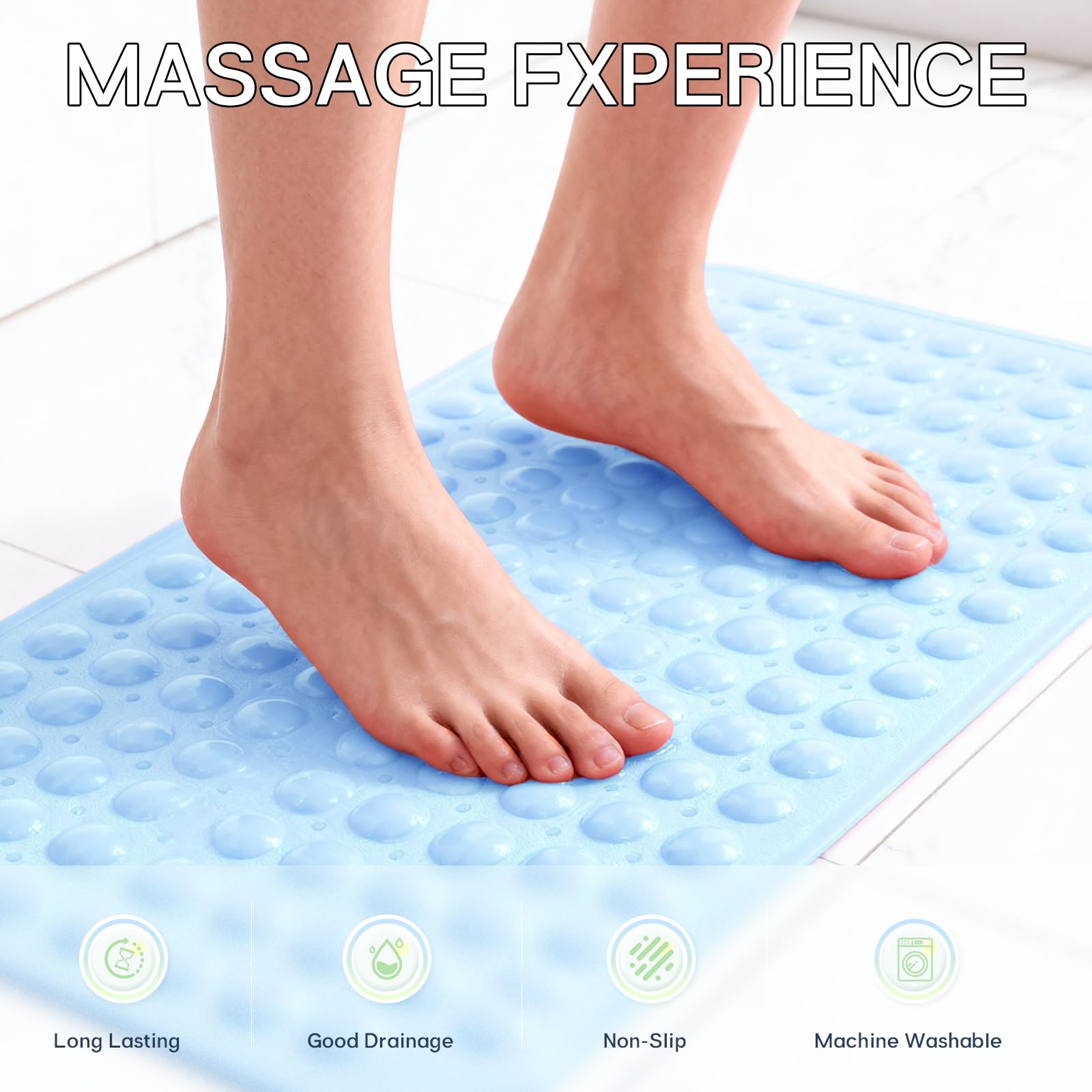 FUNCTIONAL BATHROOM MAT: Our versatile bath mat features a domed design resembling pebbles, offering a massage-like experience during shower time. The irregular texture on the surface enhances friction and prevents slipping. Additionally, with 128 small drain holes, water circulation is optimized and smoother drainage.