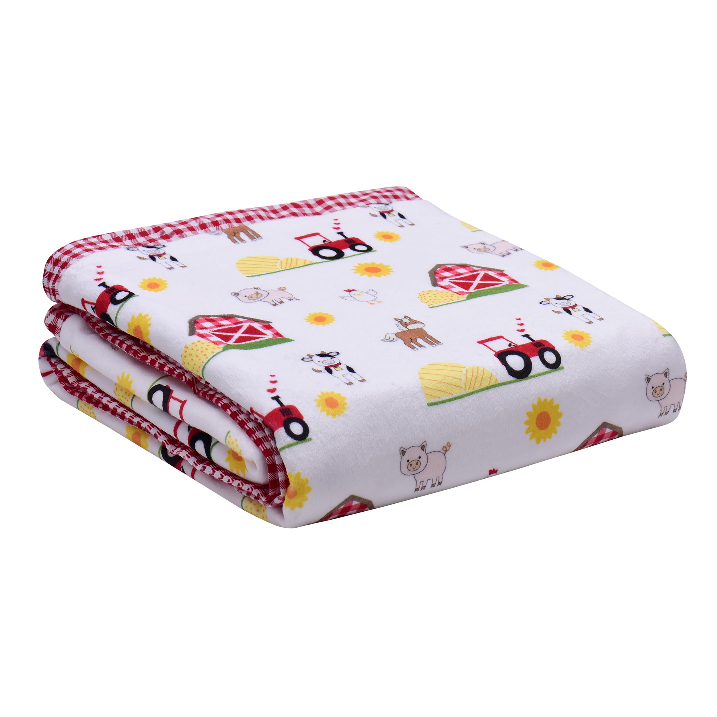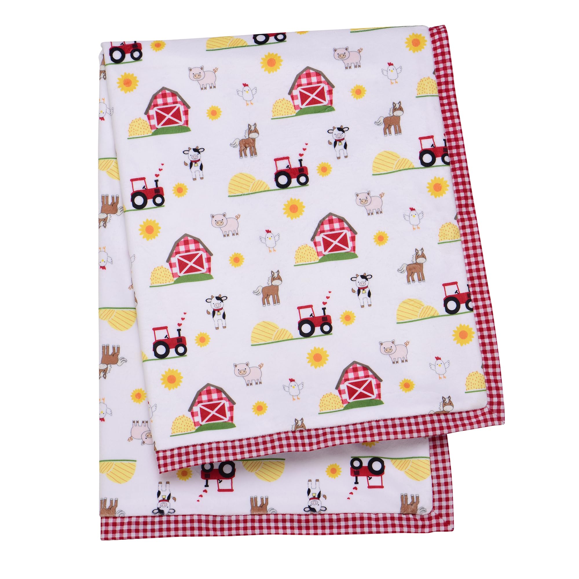 Soft and cuddly, this silky soft baby blanket (30 in x40 in) is the perfect for a new baby and parents. The soft, double layer reversible blanket is printed on one side and a solid color on the reverse. The farm design is accented with a gingham trim. The 2 ply blanket is great for snuggling and tummy time at home or while traveling with baby.