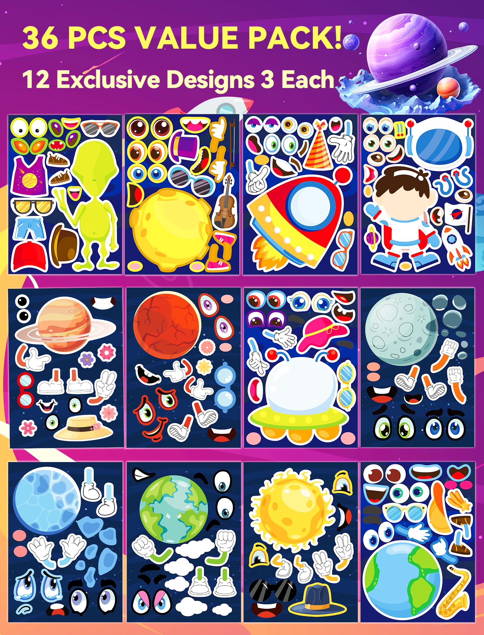 π½Children's Space Sticker Set: Featuring cute cartoon planets, aliens, astronauts, rockets, and other outer space elements, this set offers rich expressions that allow children to immerse themselves in the joy of exploring the outer space world. (12 Designs, 3 Each)