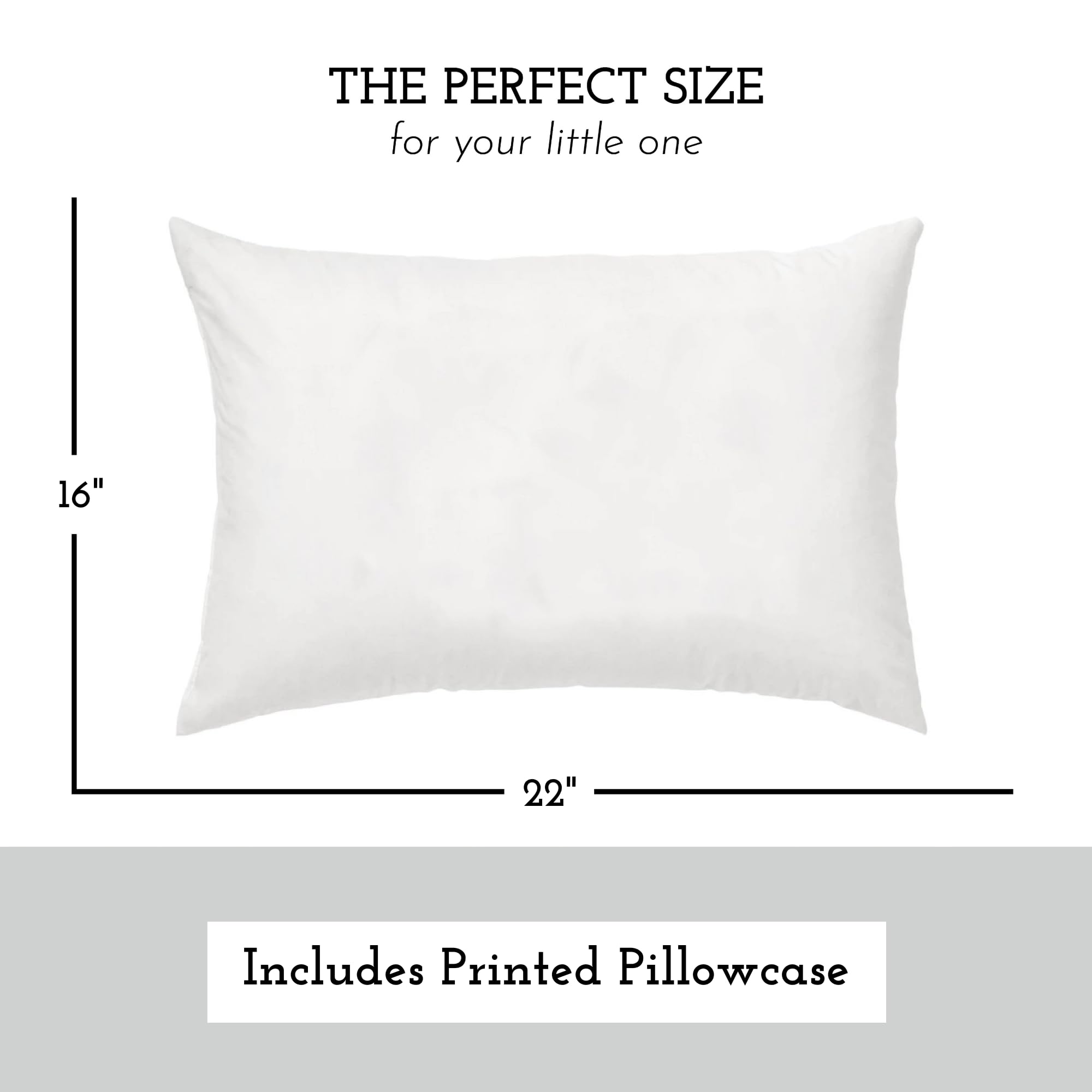 Youth Pillow with Pillowcase 16x22: This is the perfect pillow for your not-so-little kid! In between our toddler pillow and a standard pillow, our 16" X 22" youth pillow is the best pillow for children 4+, or toddlers that need something a bit larger! Comes in colorful designs that appeal to kids.