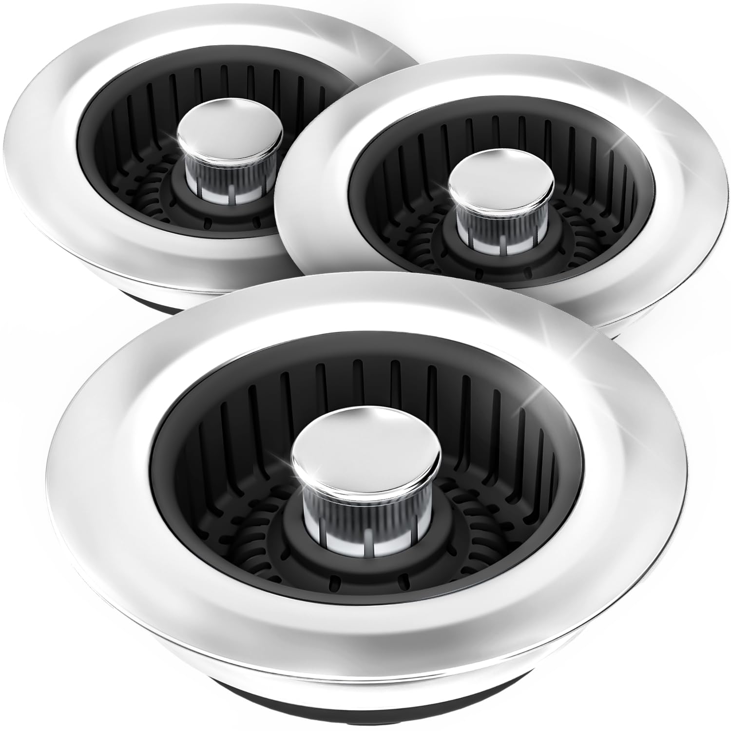 【Upgraded 3 in 1 Kitchen Sink Drain Strainer】Our kitchen sink strainer, combines sink drain strainer, kitchen sink stopper and odor isolation together. Press down the pop up button to store water for washing, press again to drain water while catching food waste or scrap from going down the drain. A reliable anti clogging helper and a must have kitchen sink installation parts