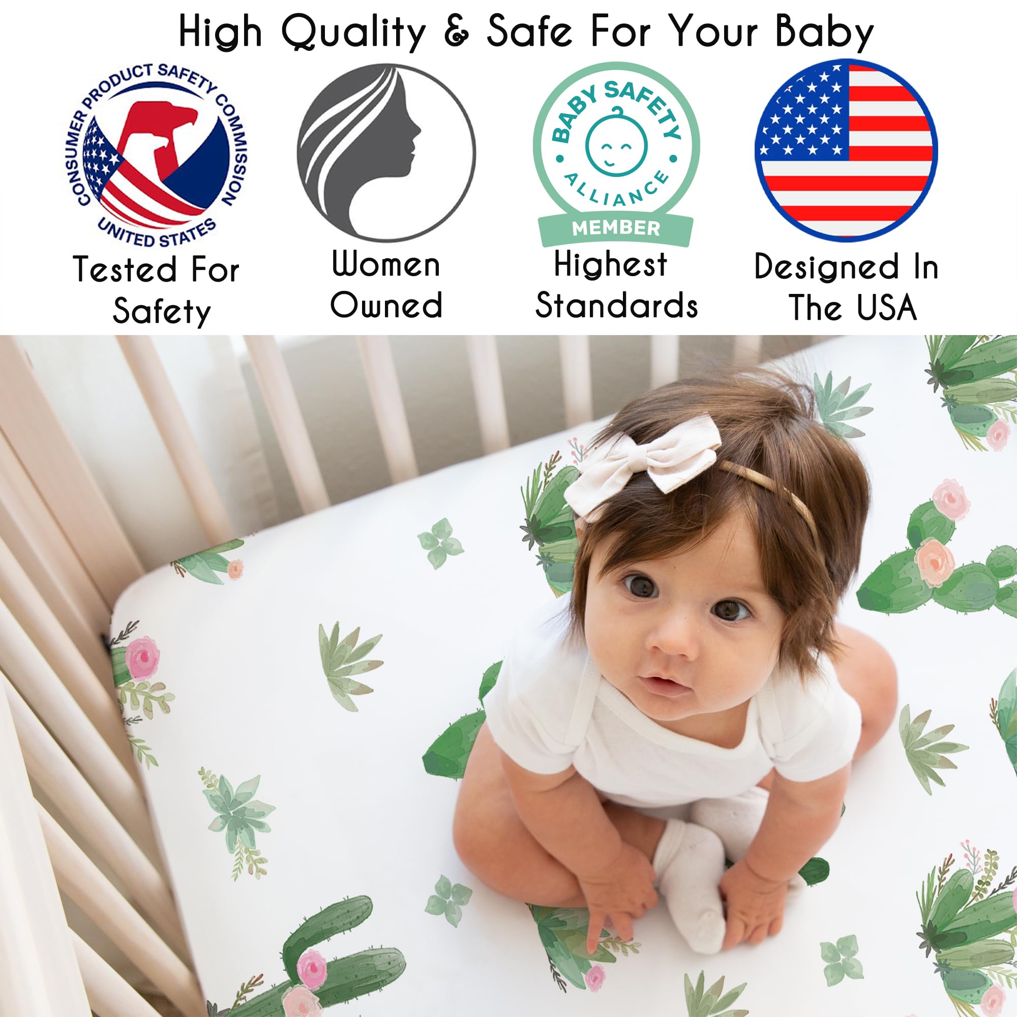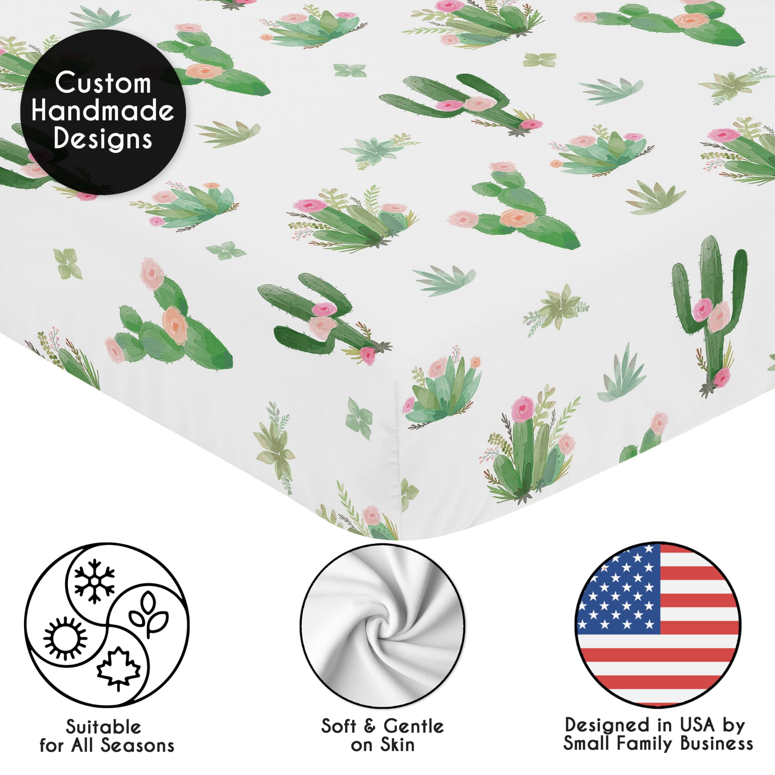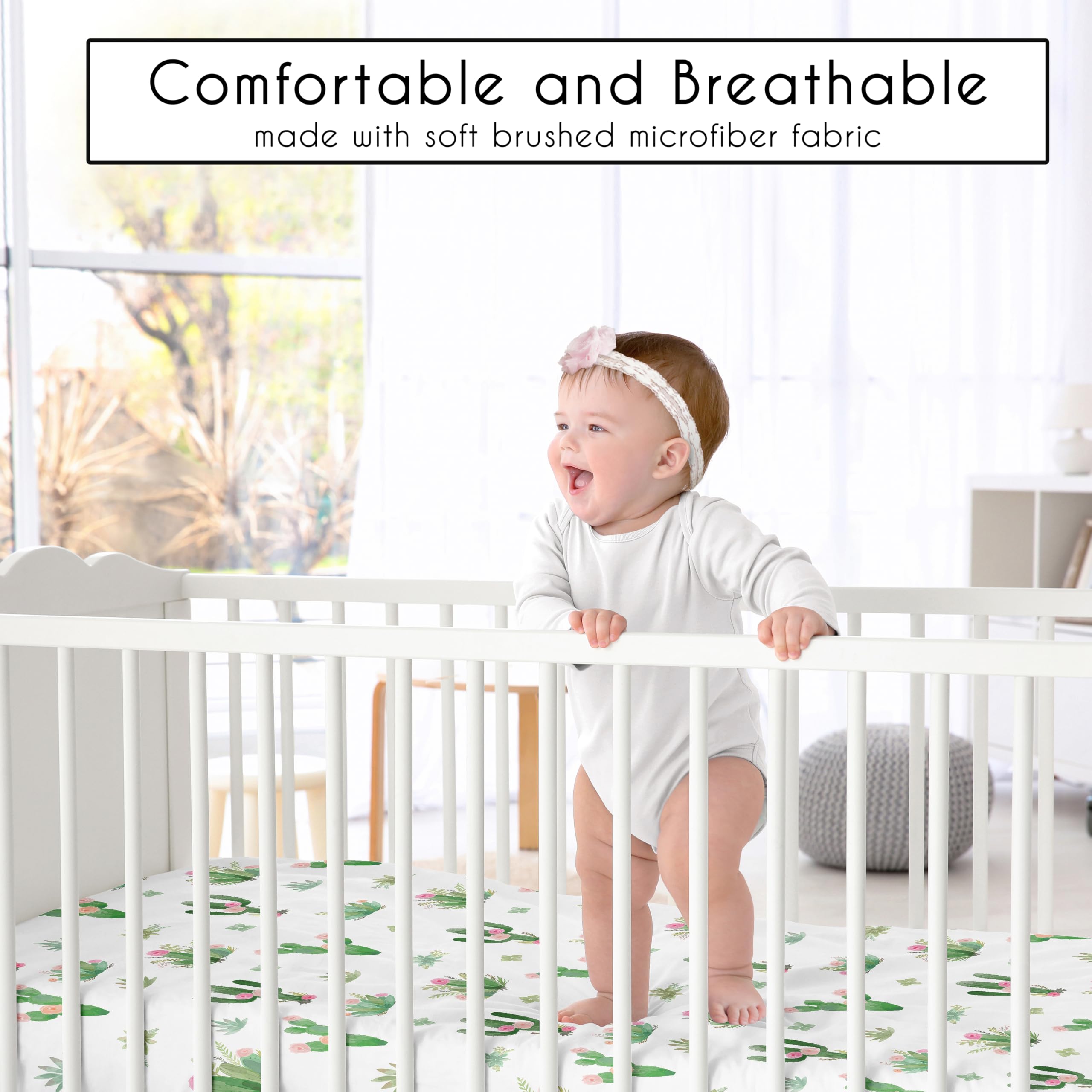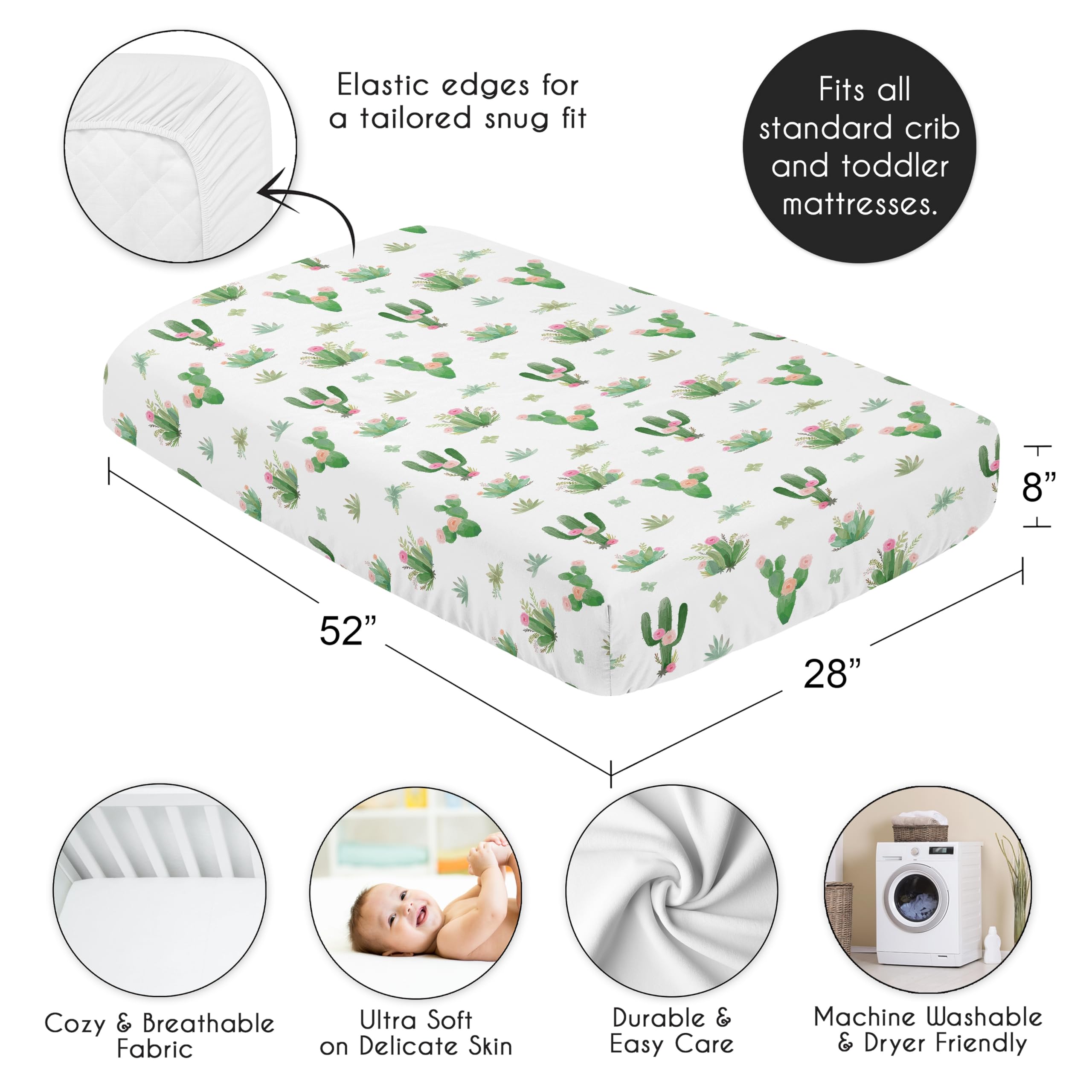 SNUG FIT: Includes (1) Fitted Crib Sheet 52in. x 28in. x 8in. Our newborn standard crib sheets fit snugly, with premium elastic sewn around the entire bottom edge for a secure fit on most standard sized cribs and toddler beds, to reduce shifting and bunching. This brushed microfiber crib sheet features an exclusive design of a girly blush pink, green and white watercolor, shabby chic, cacti, desert, boho cactus floral print and is gentle on delicate skin to foster a soothing sleep environment.