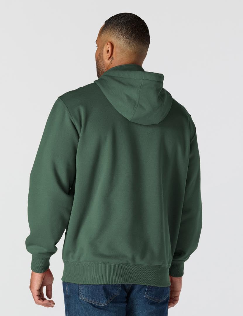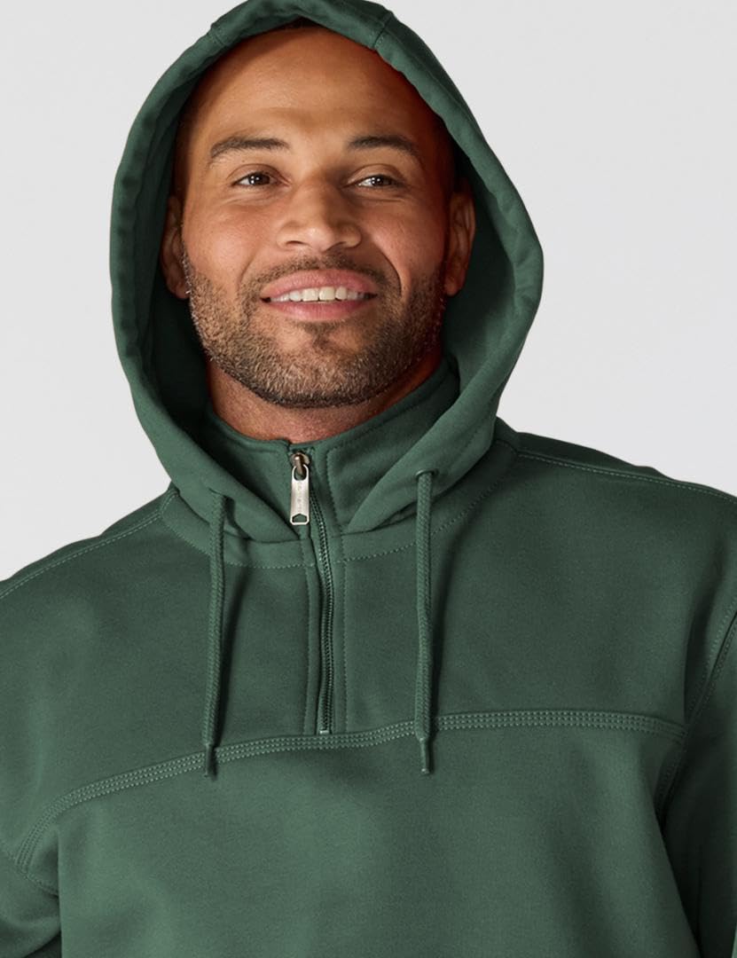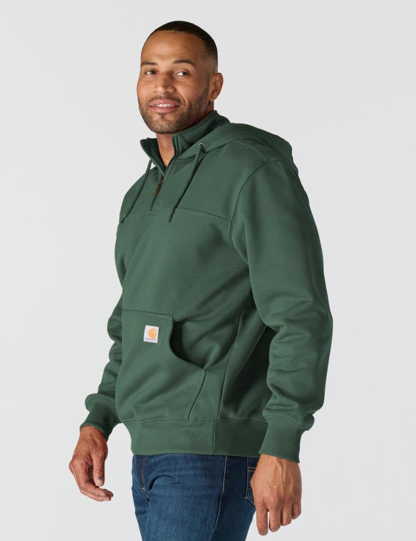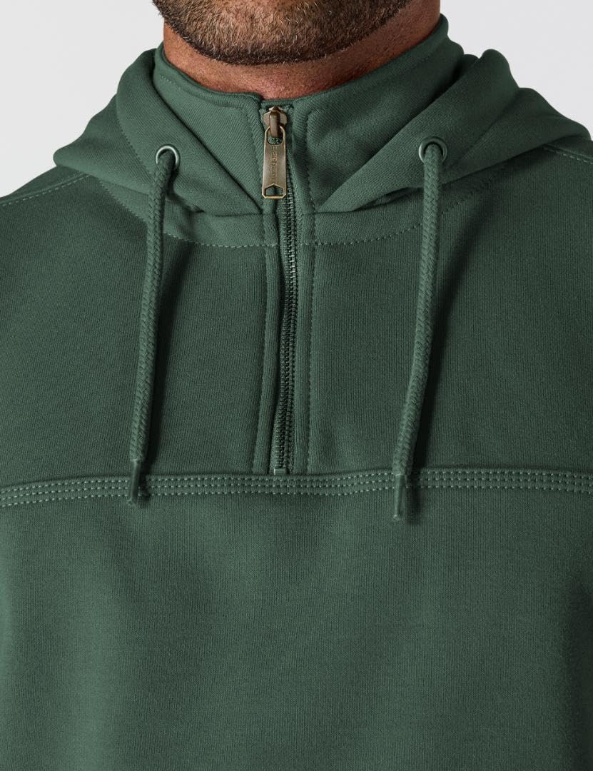 Description The heavyweight champion of sweatshirts is made of 13-ounce, 75% cotton/25% polyester fabric and has a Rain Defender durable water-repellent finish. The zip-mock collar has an 8-inch antique-finish brass zipper. It is designed with spandex-reinforced rib-knit cuffs and waistband to keep the cold out. There's an attached three-piece jersey-lined hood with draw cord and front hand-warmer pocket. The Carhartt logo is embroidered on the front left pocket.