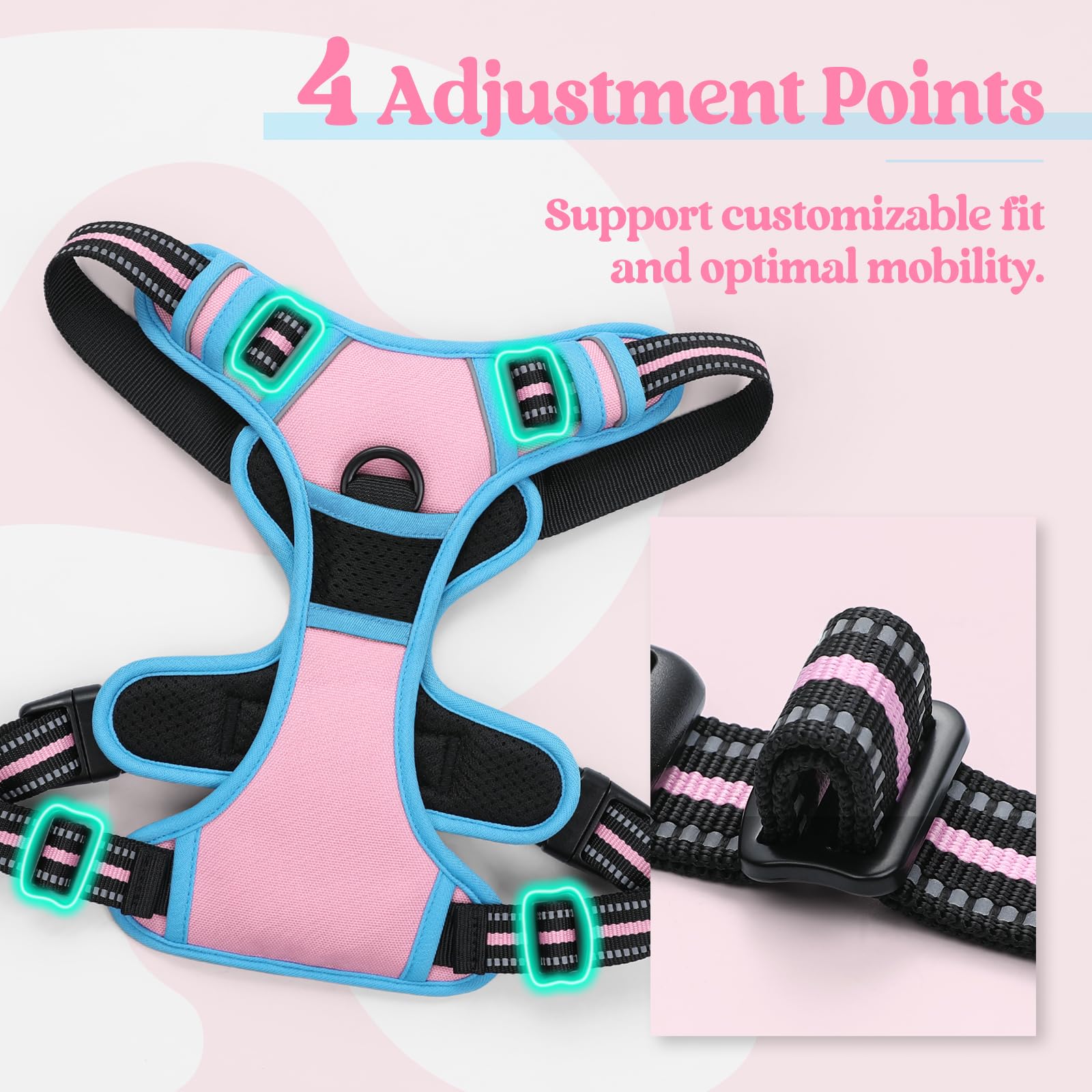 Fully Adjustable - This adjustable harness features 4 easy adjusting straps around the body. You can use its 2 neck straps and 2 chest straps to create a perfect fit for your dog with some room of growth. No worries about slipping out or choking