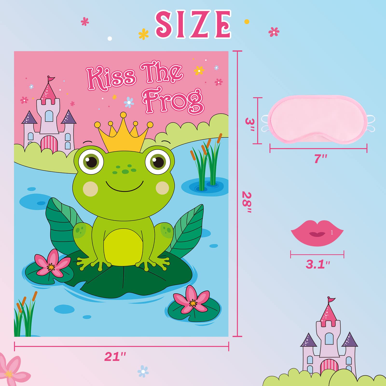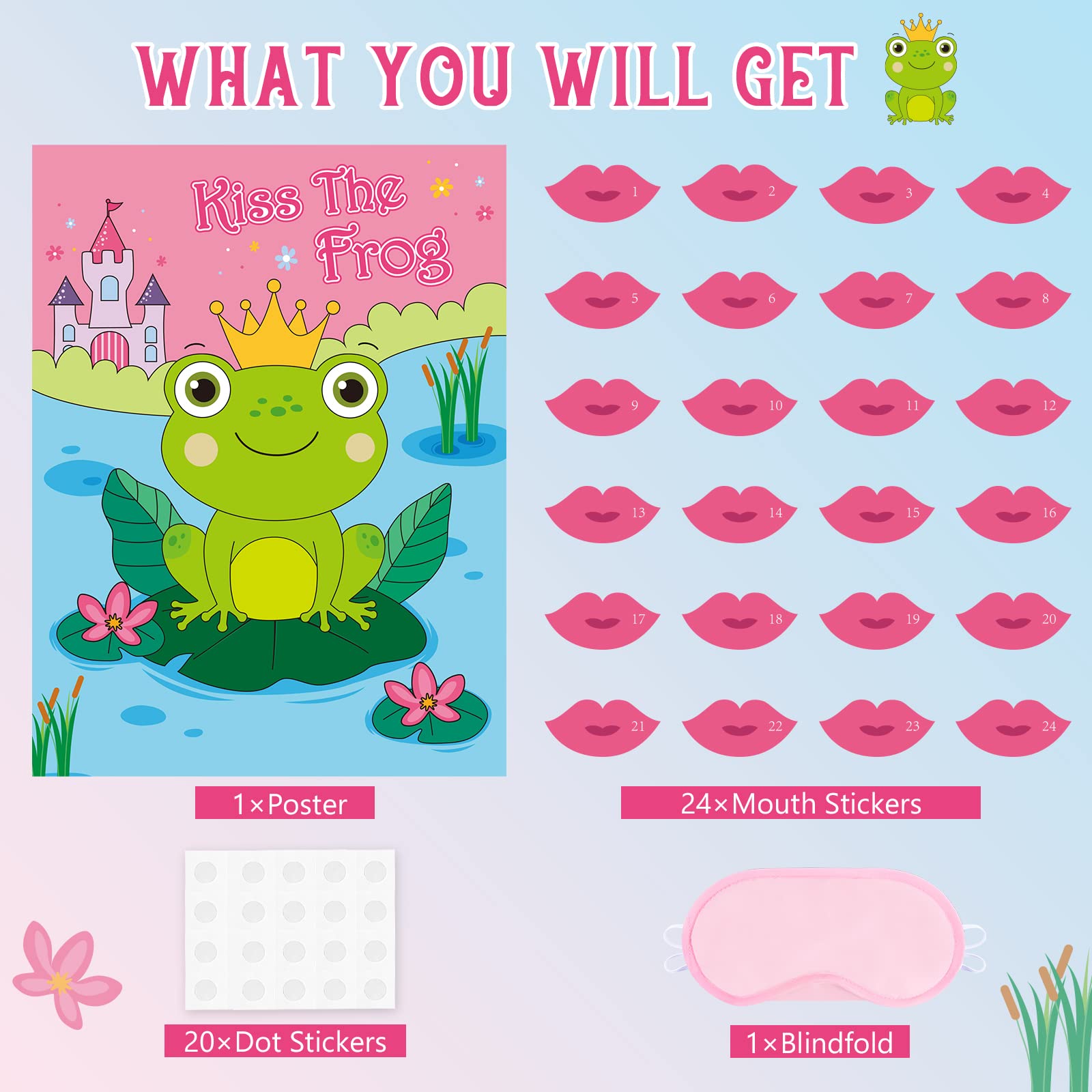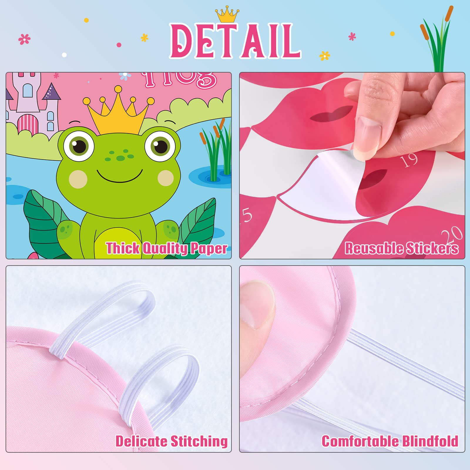 PACKAGE & MATERIALS - Includes: 1 * 21" x 28" Frog game poster, 1 * blindfold, 24 * reusable kiss stickers, 20 dot stickers.