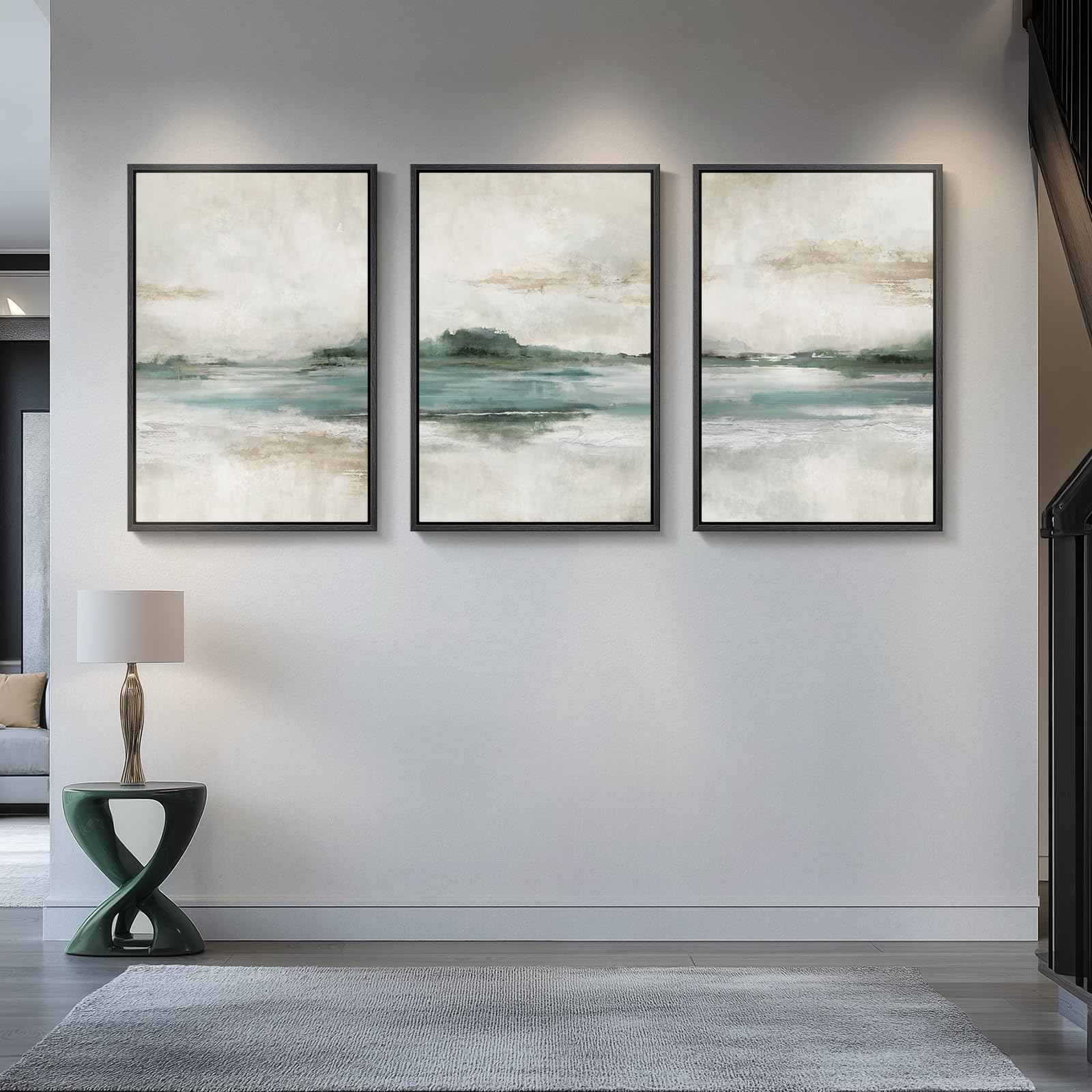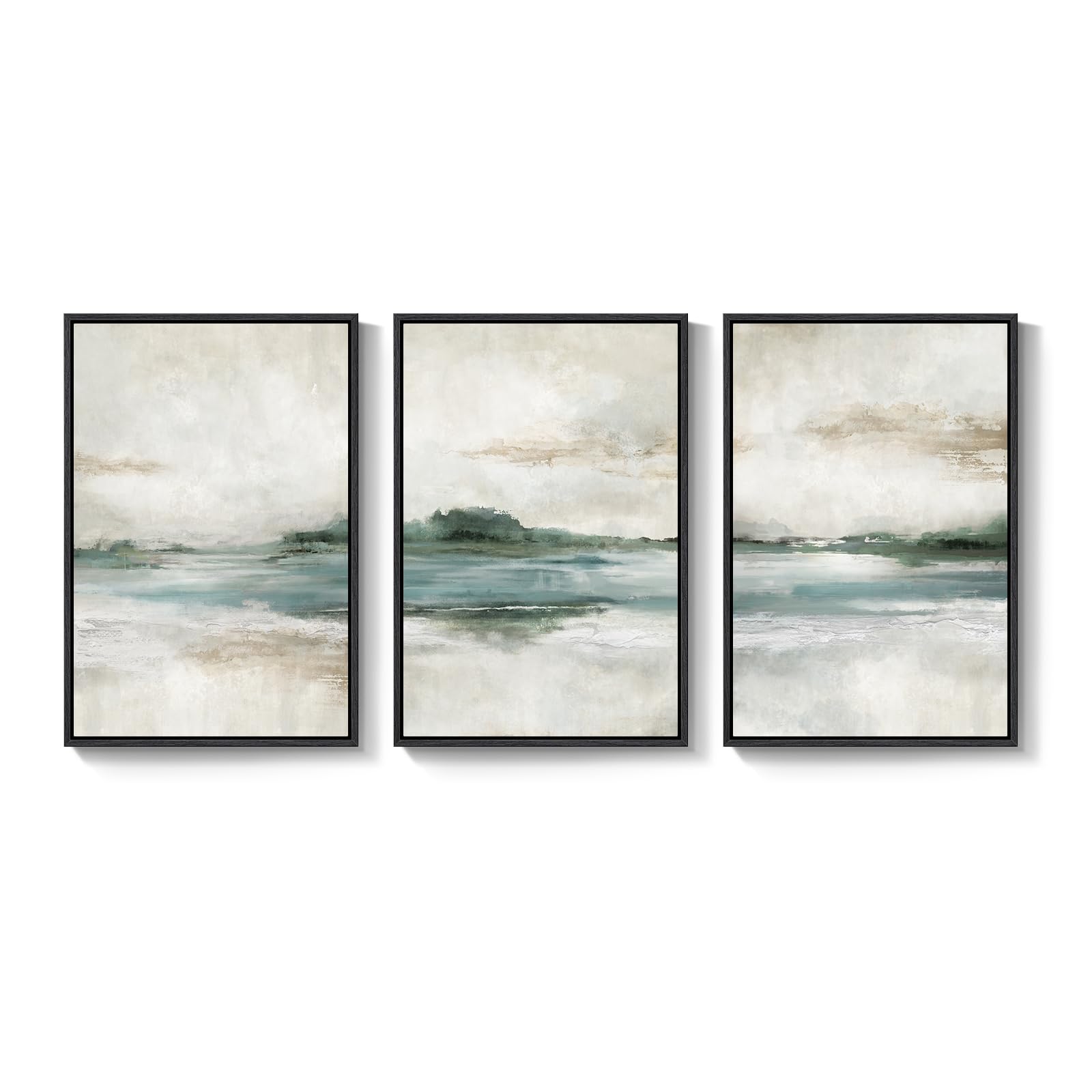 [Abstract Wall Art]: This 3-piece large framed wall art set features a modern abstract lake and mountain landscape in soft watercolor style. Shades of green, teal, beige, and warm neutrals create a calming, elegant look that blends seamlessly with contemporary or transitional decor. Perfect for the living room, bedroom, dining room, hallway, or office, these canvas prints bring timeless beauty and sophisticated wall decoration to any space