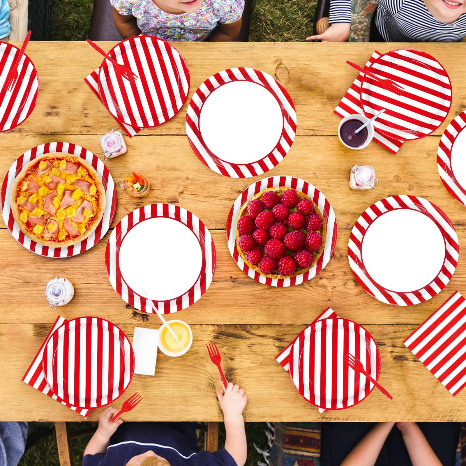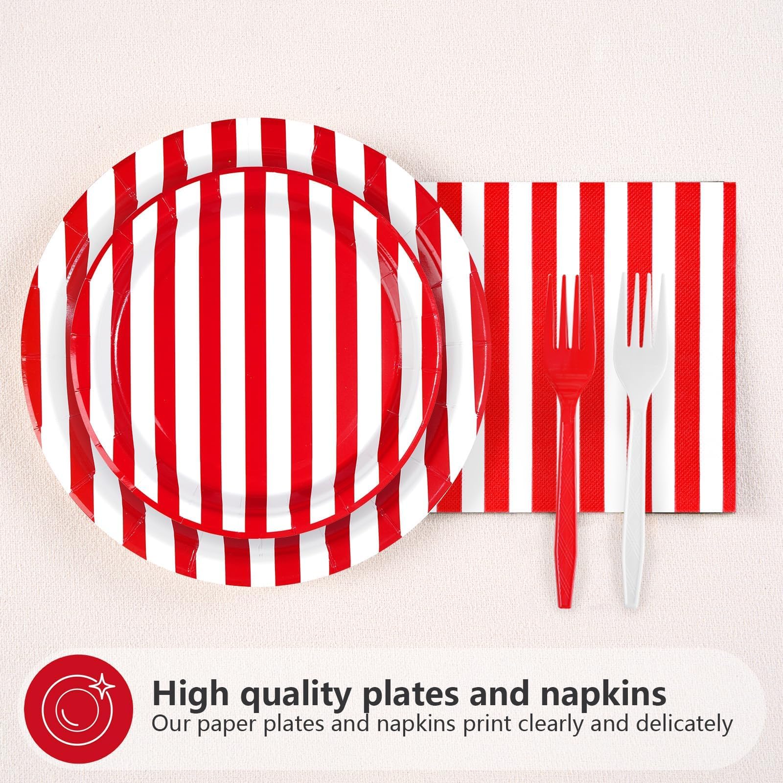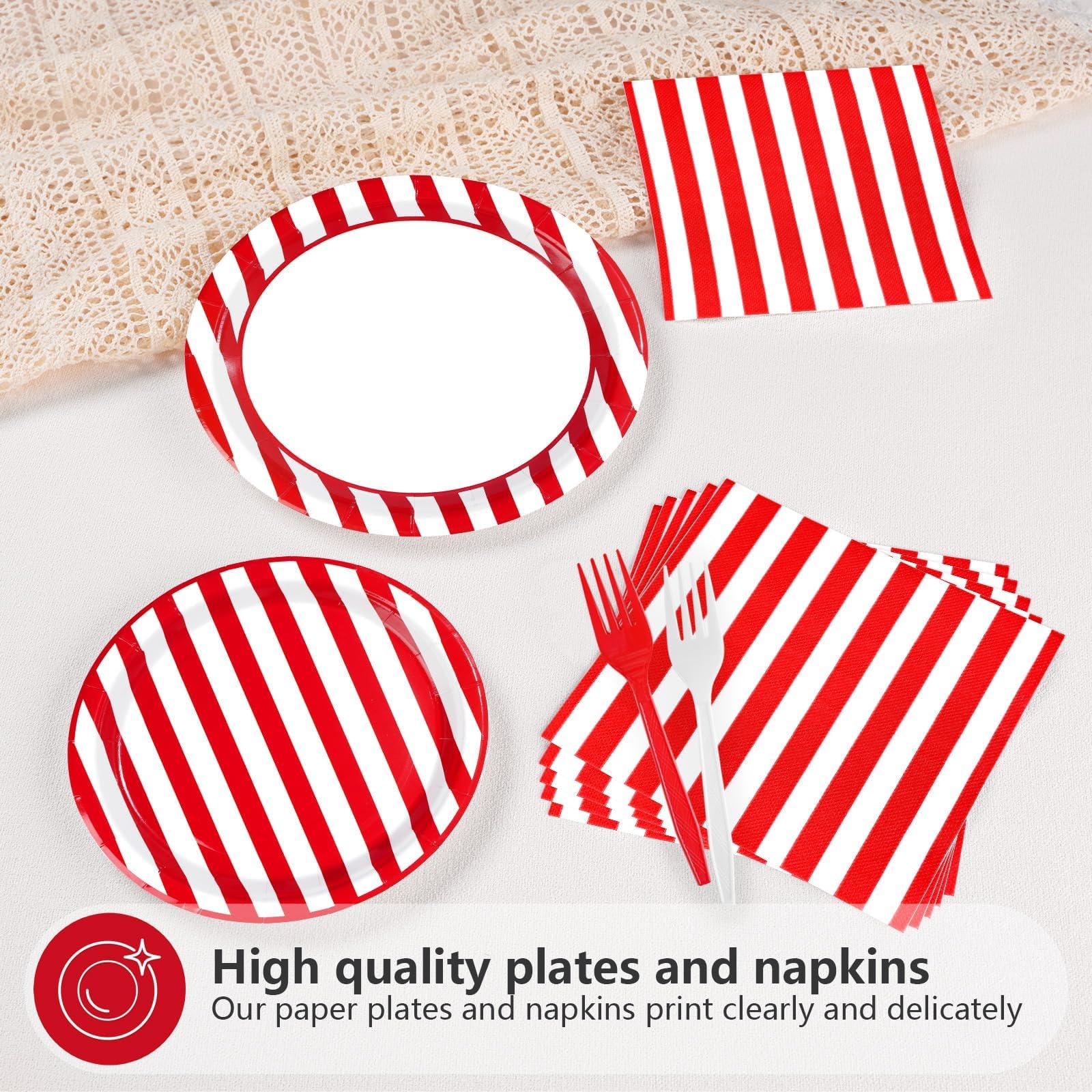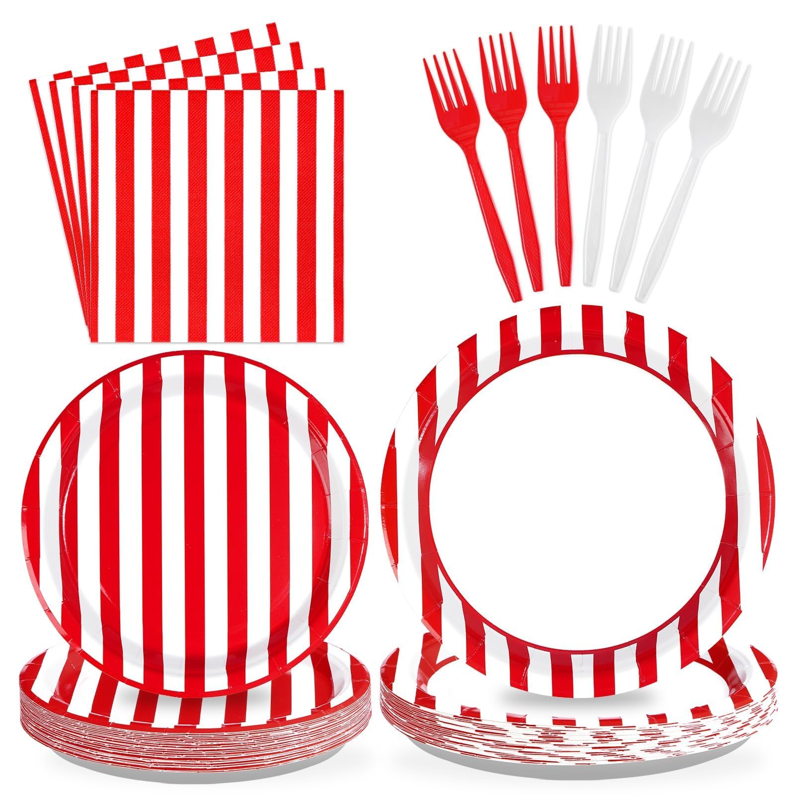 Red and White Party Supplies: Our red and white striped party tableware set include 24pcs red and white party plates of 9'', 24pcs red and white plates of 7'', 24pcs napkins of 6.5'' and 24 plastic forks. These red and white party essentials are perfect for adding a touch of sophistication and elegance to any occasion