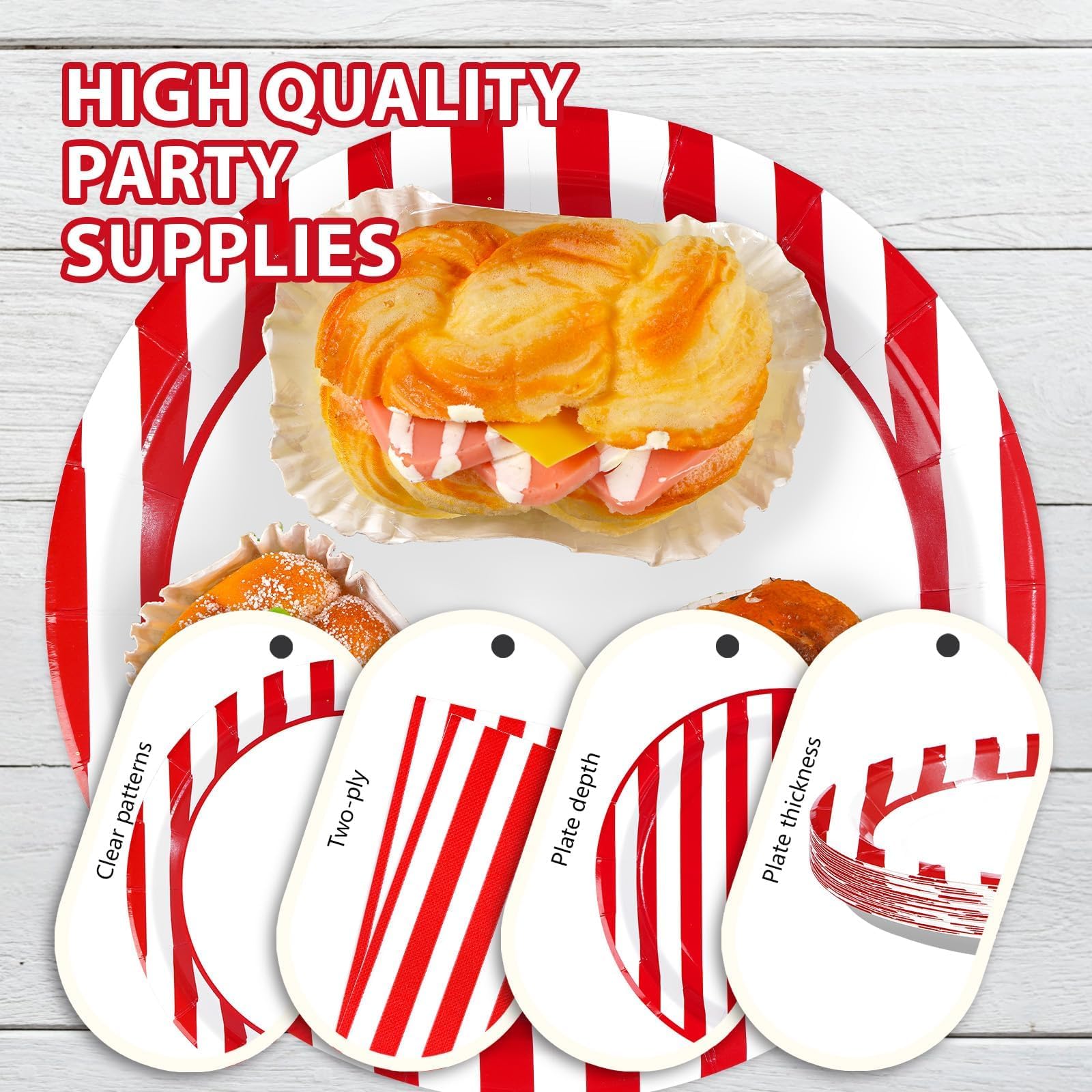Premium Material: The red and white disposable plates are made of heavy duty paper. Striped disposable party plates are designed to be strong enough to hold a full plate of food without folding and tearing. Napkins are soft and absorbent. Napkins are thick to ensure durability (Tips:Please do not microwave these products)