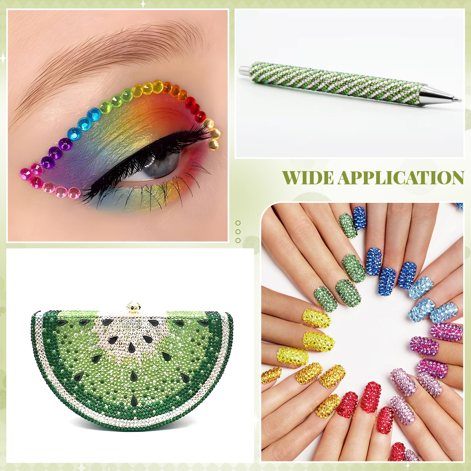 WIDE APPLICATION -- The iridescent and bedazzling gems will remarkably add glitz to your DIY crafts, like shoes, sneakers, high heels, tumblers, mugs, goblets, bottles, clothes, dresses, jeans, hats, masks, glasses, phone cases, popsockets, scrapbooks, diamond paintings, greeting cards, bags, guitars, keychains, hair clips, etc. You can use them for face makeup, eye makeup, body art, 3D nail art as well. Apply it to whatever you want to bedazzle!