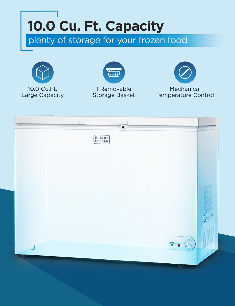 Deep Freezer Storage: Large 10 cu. ft. capacity holds a substantial amount of frozen foods including cold meat, frozen dinners and ice cream. Keeps perishables frozen for your home or garage