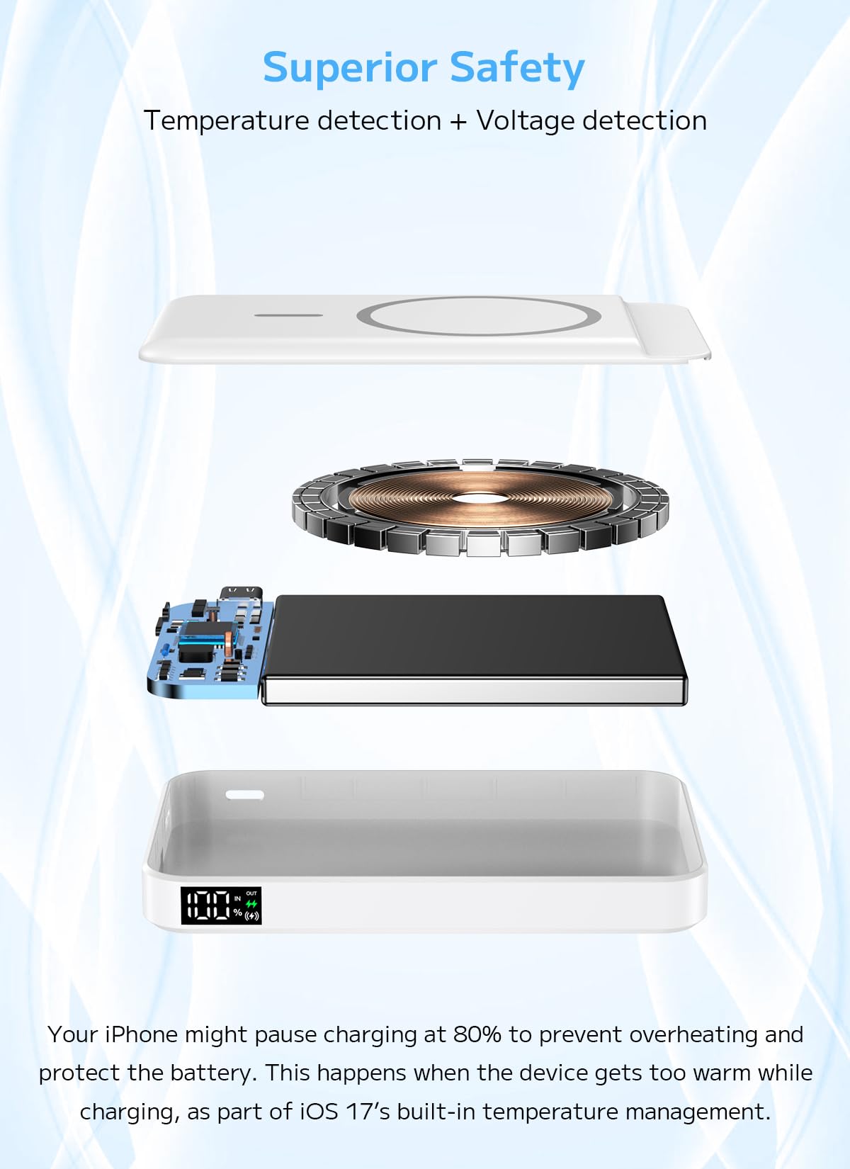 【Wide Compatibility & Secure Attachment】:Designed for MagSafe iPhones and compatible with wireless-charging Android devices with magnetic ring. For the strongest magnetic hold during travel or activities, we recommend using a for MagSafe-compatible case or bare iPhone. Avoid connection issues with non-magnetic cases. Perfect for travelers, students, and professionals who need dependable charging without interruptions. Keep your iPhone powered securely during flights, meetings, or adventures—every snap guarantees stable energy.