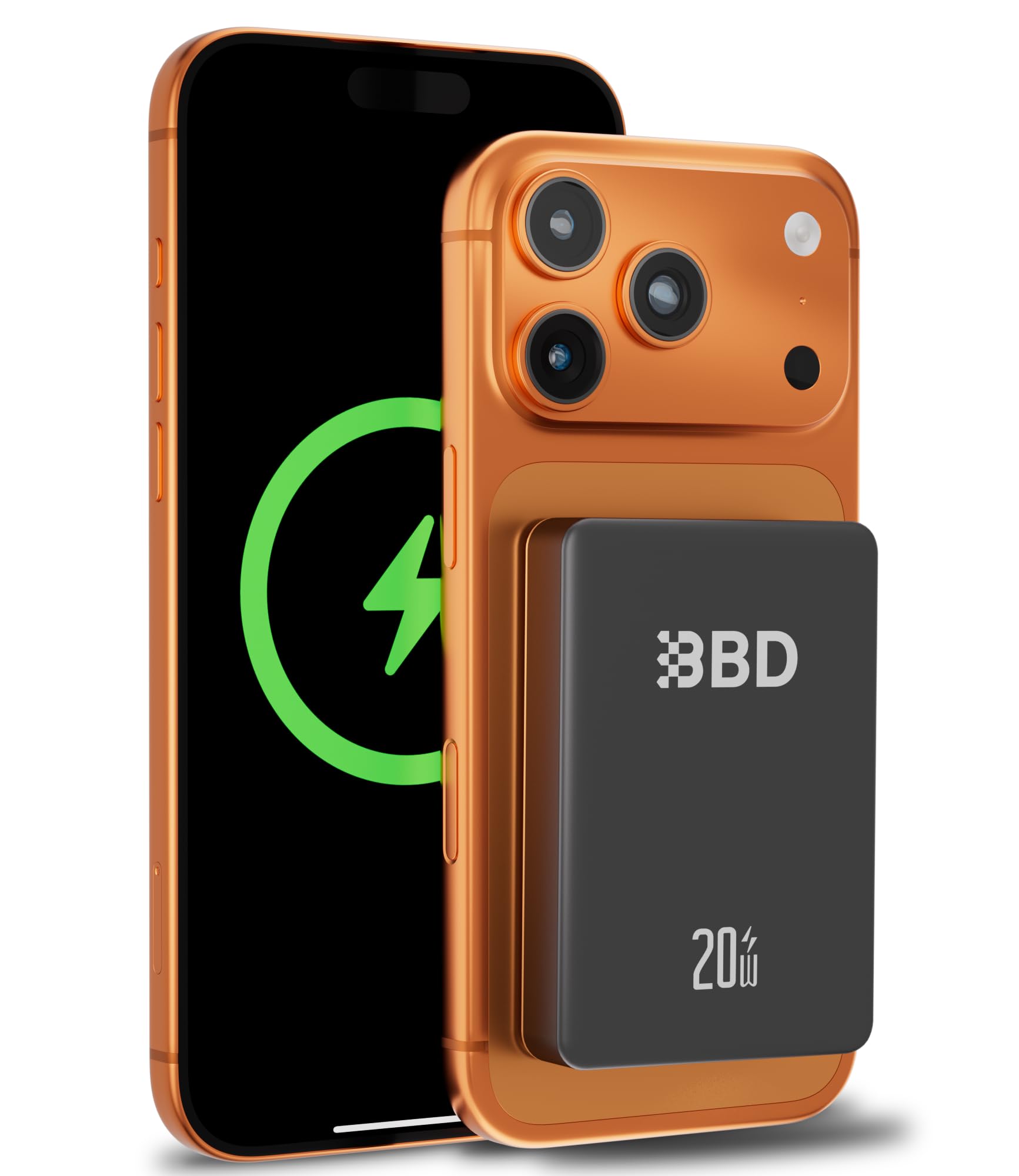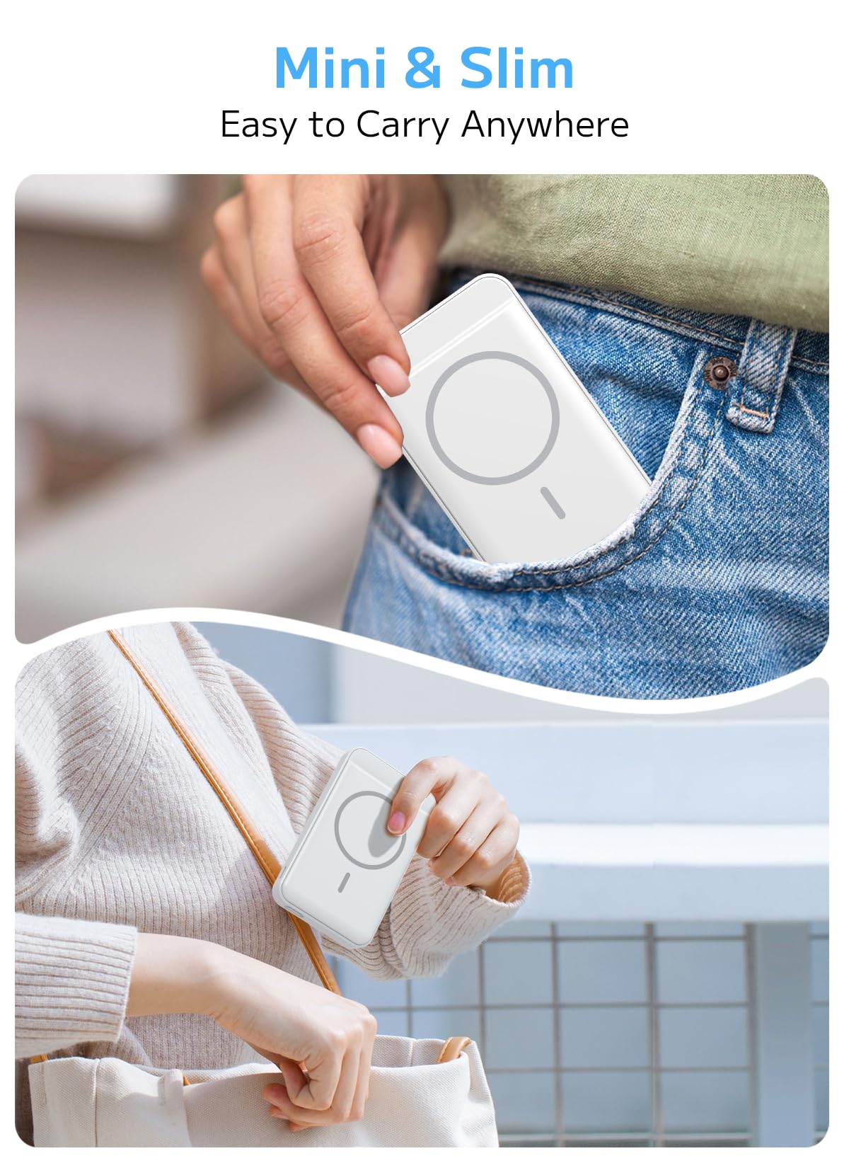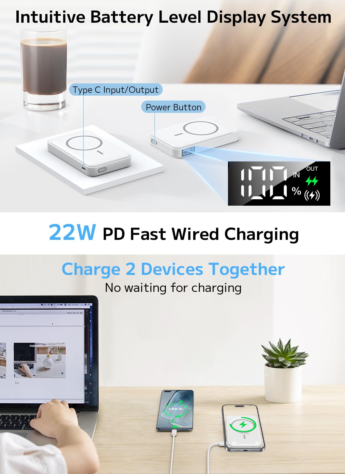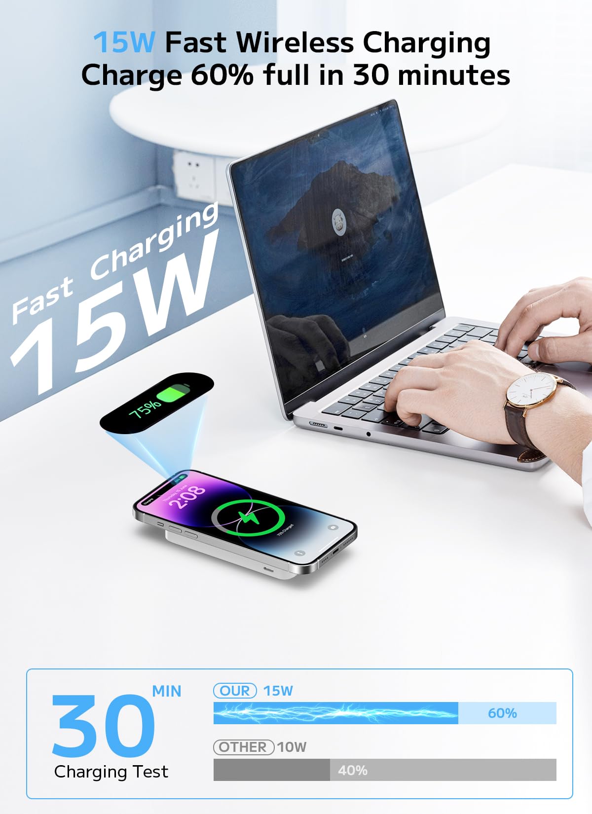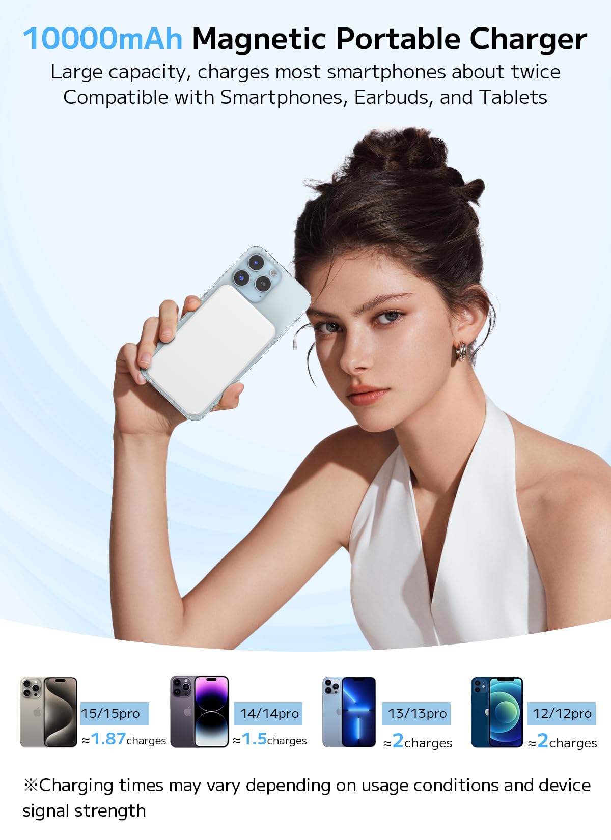 【10,000mAh High-Capacity & Dual Fast Charging】:Never run out of power with this portable charger power bank. The 10000mAh battery delivers up to 2 full charges for iPhone 15 Pro Max or 30+ hours of extra battery life, giving you reliable power throughout travel, long workdays, or unexpected emergencies. Simultaneously charge your iPhone via for MagSafe wireless charging at 15W and another device like AirPods or an Apple Watch using the 20W Type-C wired output. Recharge the power bank quickly with 18W input via Type-C. Perfect for multitaskers who need all devices ready at once.
