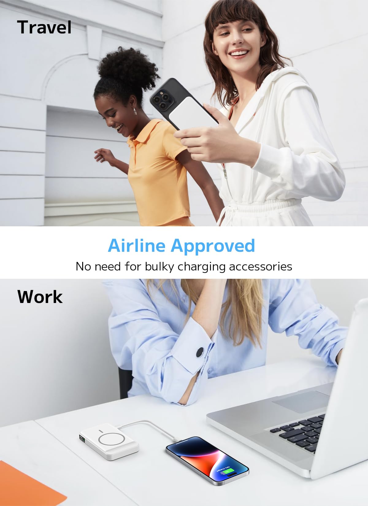 【Pocket-Friendly Design & Smart LED Display】:This compact portable charger (4.1”x2.7”x0.6”, 0.5lb) slips easily into pockets or small bags, making it ideal for flights, hikes, or daily commutes. Ditch bulky chargers and tangled cables. This magnetic power bank eliminates the hassle of packing, untangling, or losing charging wires during travel. The slim design won’t block your camera, and the matte finish resists fingerprints. Stay organized and space-efficient while enjoying true wireless freedom. The built-in LED screen Always know your power status with the precise LED battery indicator—no more guessing battery!