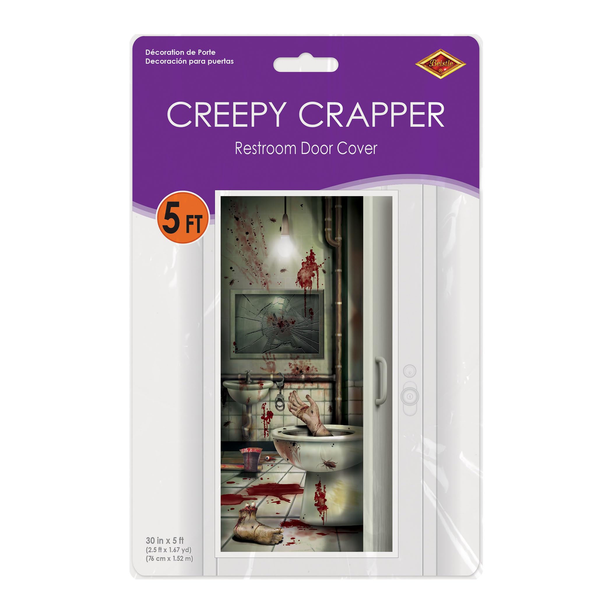 Beistle 00009 Creepy Crapper Restroom Door Cover. Each door cover is printed one side on 2.25 mil plastic and measures 30 Inch by 5 feet. Indoor and outdoor use. Great for any Halloween home party or haunted house.