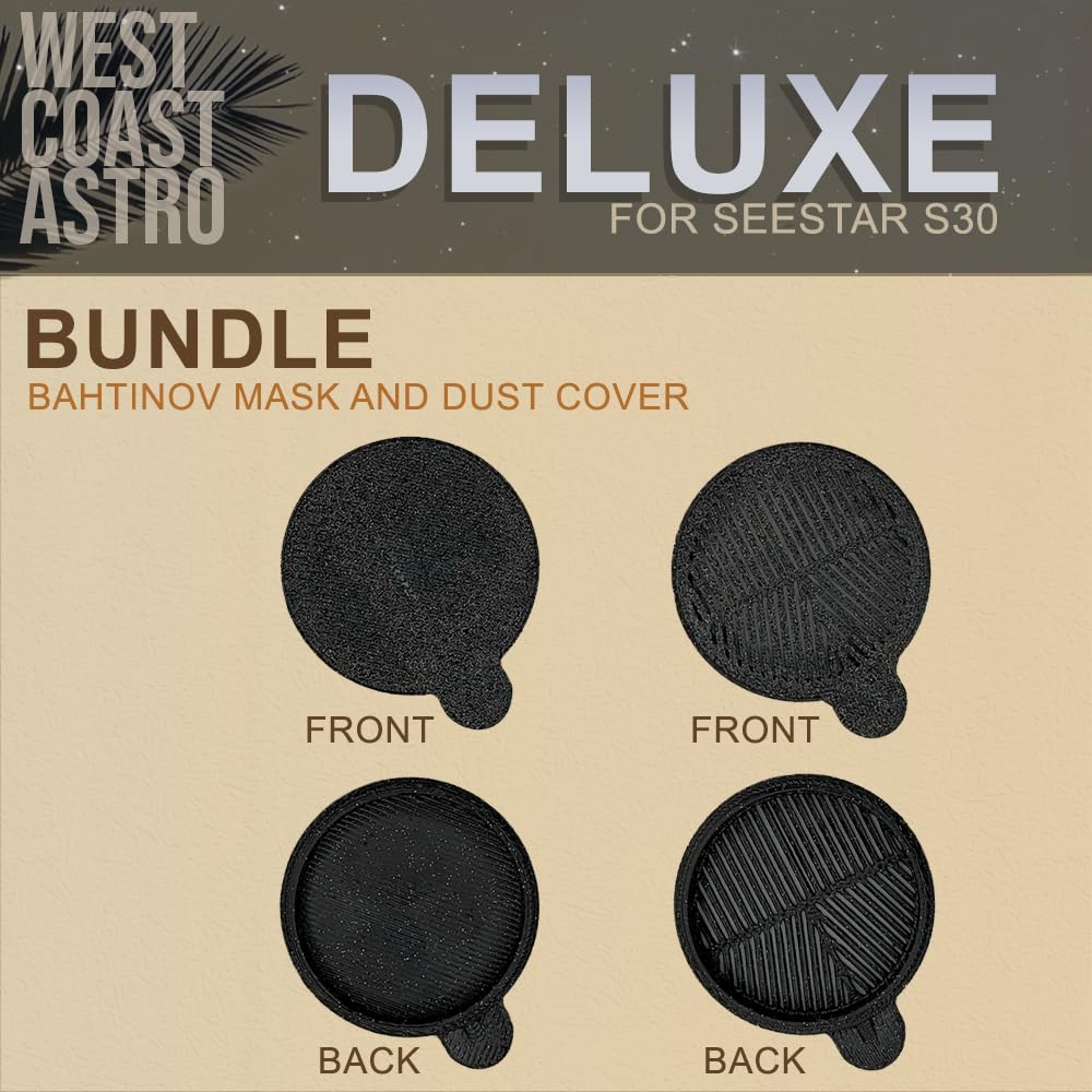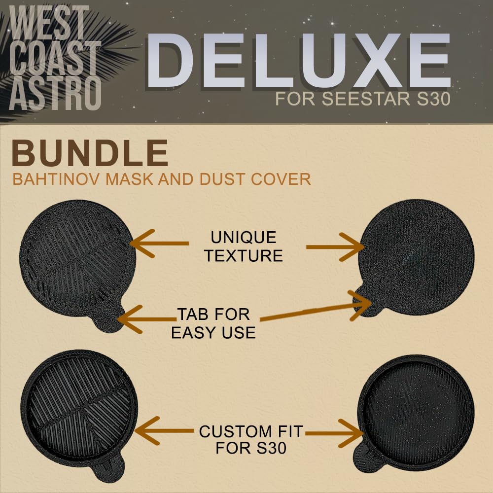 This includes BOTH the West Coast Astro Deluxe Dust Cover and the Deluxe Bahtinov Focusing Mask Custom. 3D Printed for and precision fit for the ZWO Seestar S30 (The WHITE Seestar).