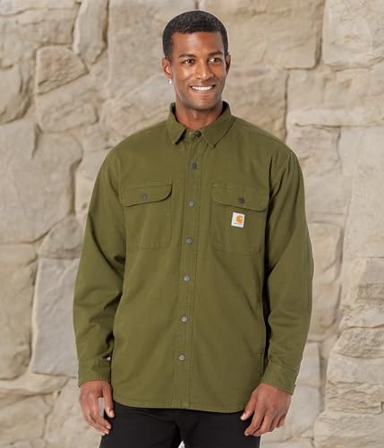 Description A workwear go-to, this men's Carhartt shirt jac is ready for cold days on the job. A fleece lining adds comfort and extra warmth. The roomy relaxed fit and durable stretch canvas give you the range of motion needed to stay working.