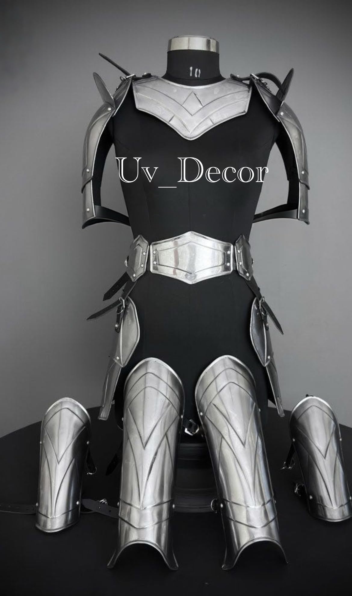 Description Medieval Knight Full Body Armor Set, crafted from durable steel and polished to a bright silver shine. This complete 10-piece suit includes shoulder armor, arm pieces, leg guards, chest plate, back plate, and more—giving you full coverage and a powerful medieval appearance. Perfect for cosplay conventions, LARP battles, Halloween costumes, stage performances, photoshoots, or medieval displays. Featuring fully adjustable leather straps, this armor fits most adults comfortably, providing both protection and mobility. Add authenticity and power to your medieval collection with this handmade silver knight armor set.