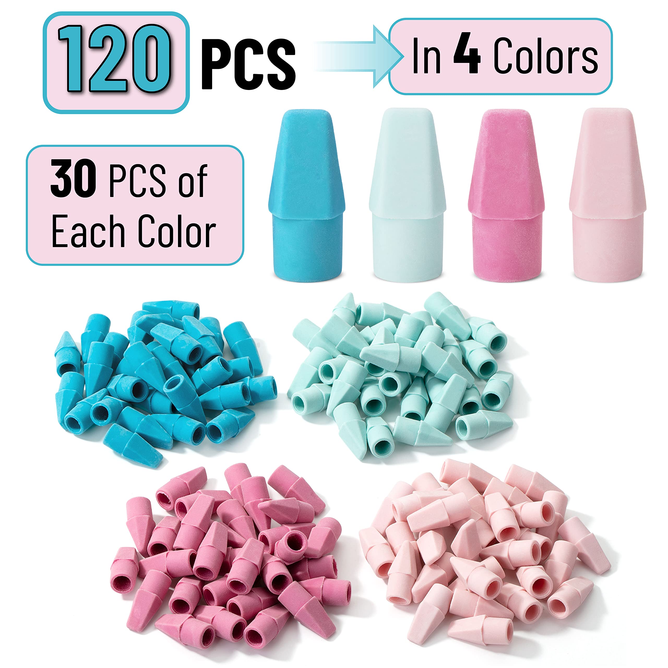 Package includes 120 pencil top erasers in 4 different beautiful colors. They can also be the protective cap for pens or pencils, prevent tips from breaking, and make clean corrections to office documents and homework.