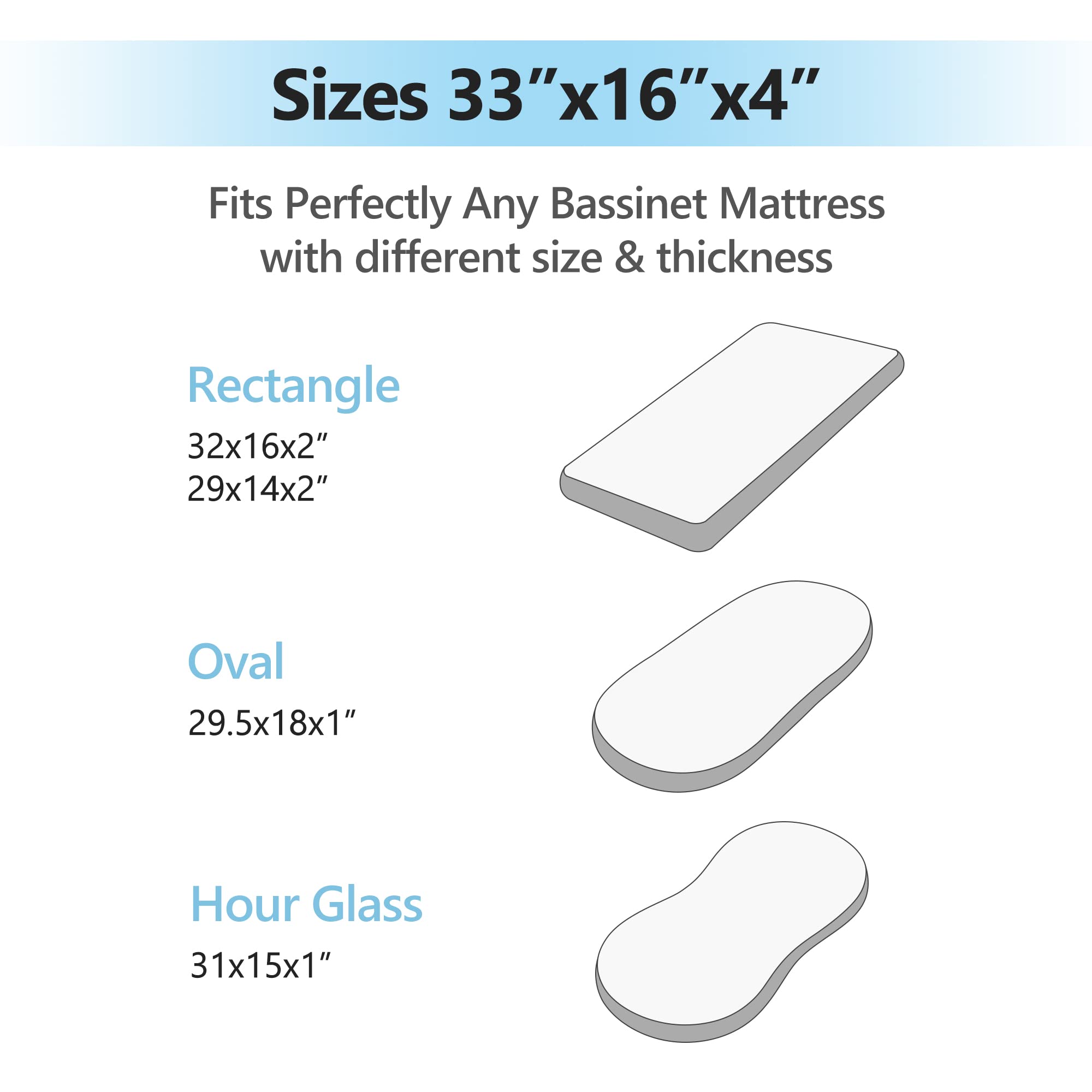 Classic Universal Size: This Bassinet Mattress Sheets have achieve a balance between elasticity and tightness. Stretches and fits oval, round, rectangular, hourglass shaped mattress up to 2.5”. No risk of mattress binding or damage.
